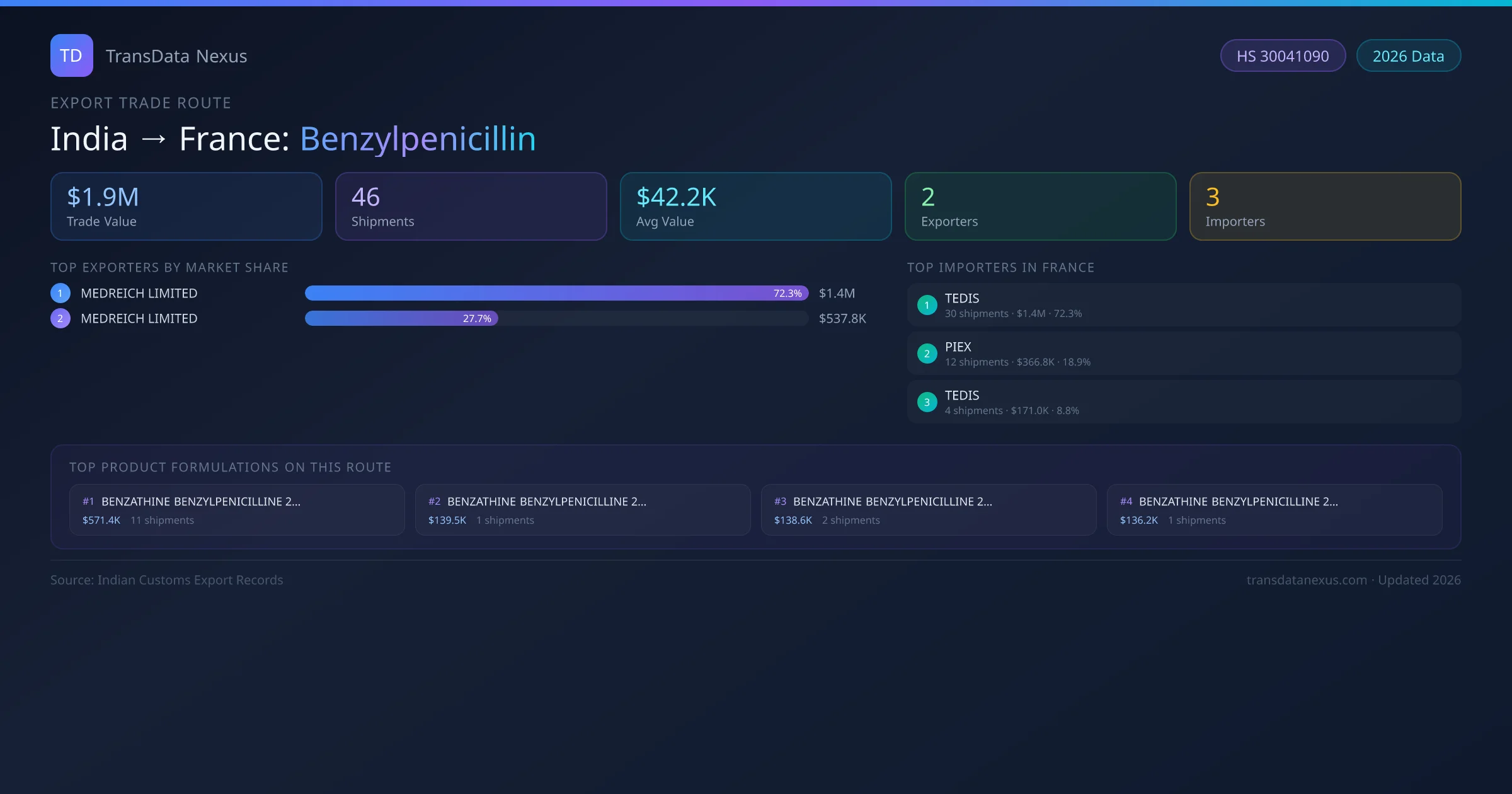 The India to France Benzylpenicillin corridor is one of India's established pharmaceutical export routes, with 46 shipments documented worth a combined $1.9M USD. The route is dominated by MEDREICH LIMITED, which alone accounts for roughly 72% of all export value, reflecting the consolidated nature of India's benzylpenicillin manufacturing sector.