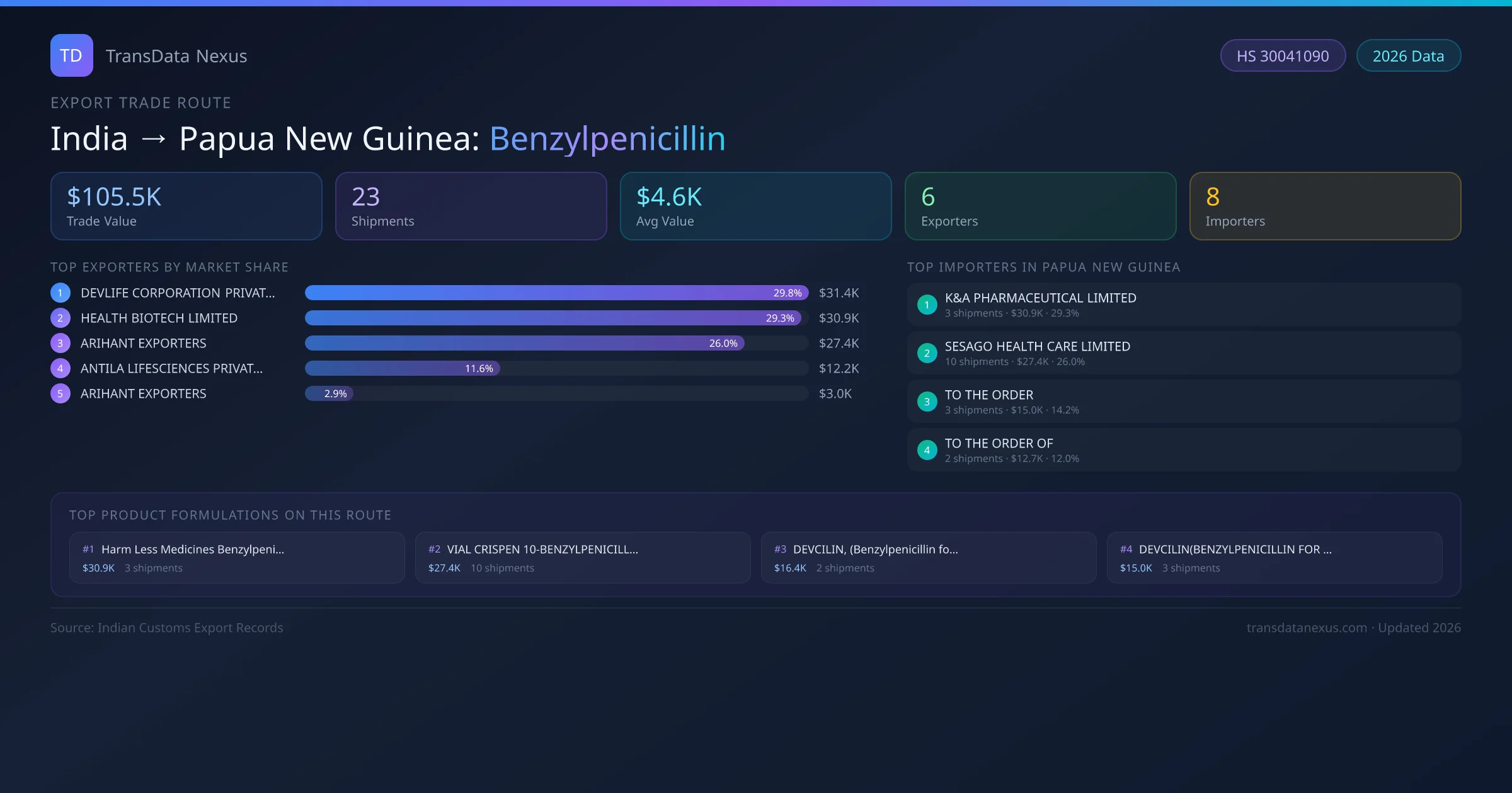 The India to Papua New Guinea Benzylpenicillin corridor is one of India's established pharmaceutical export routes, with 23 shipments documented worth a combined $105.5K USD. The route is dominated by DEVLIFE CORPORATION PRIVATE LIMITED, which alone accounts for roughly 30% of all export value, reflecting the consolidated nature of India's benzylpenicillin manufacturing sector.