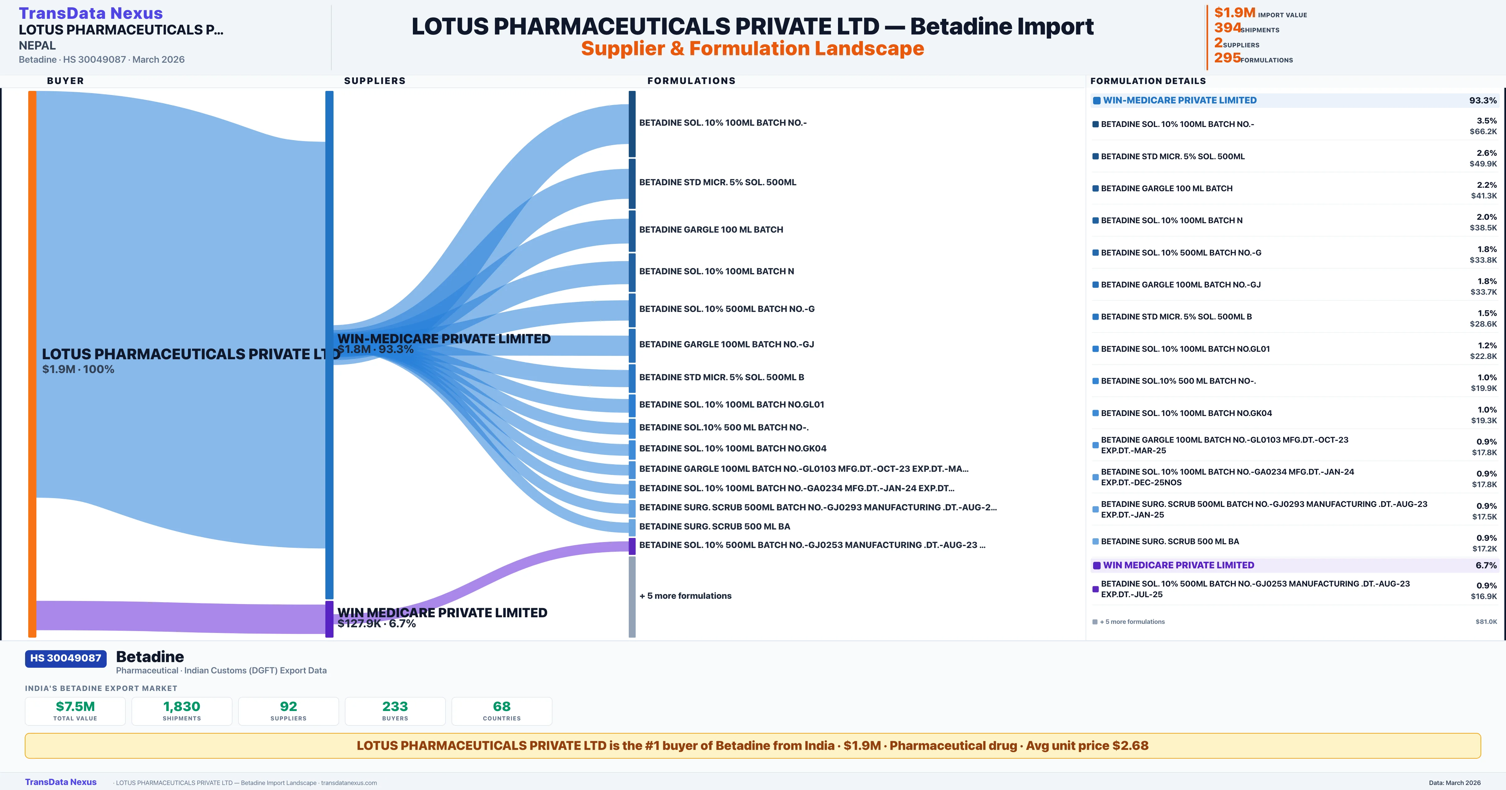 Access order-level details, pricing data, supplier connections, and competitive analysis for LOTUS PHARMACEUTICALS PRIVATE LTD's Betadine imports. TransData Nexus provides verified Indian Customs (DGFT) data trusted by pharmaceutical trade professionals worldwide.