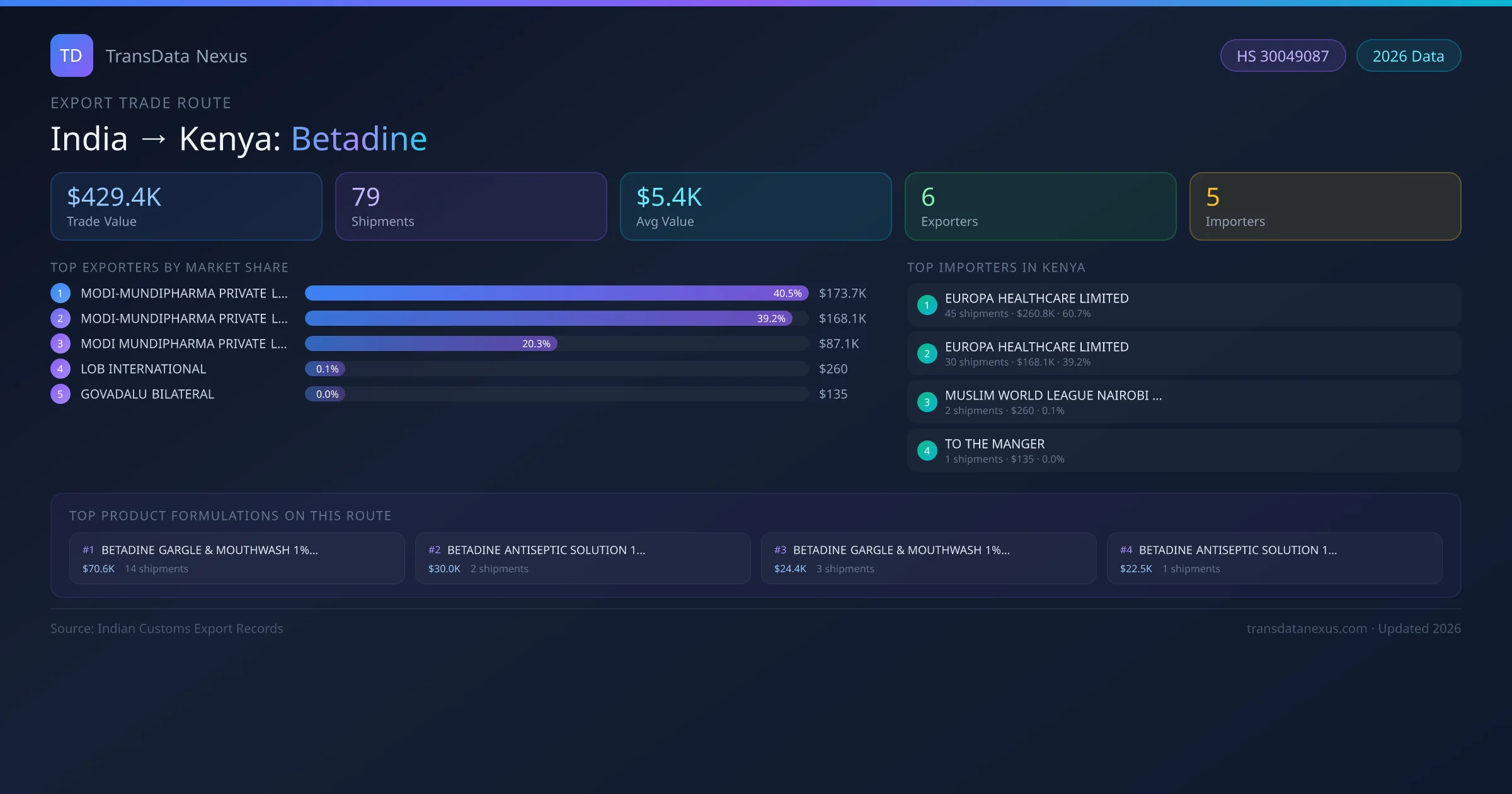 - 1.Route Identification: India to Kenya export trade corridor identified from Indian Customs (DGFT) records for Betadine.