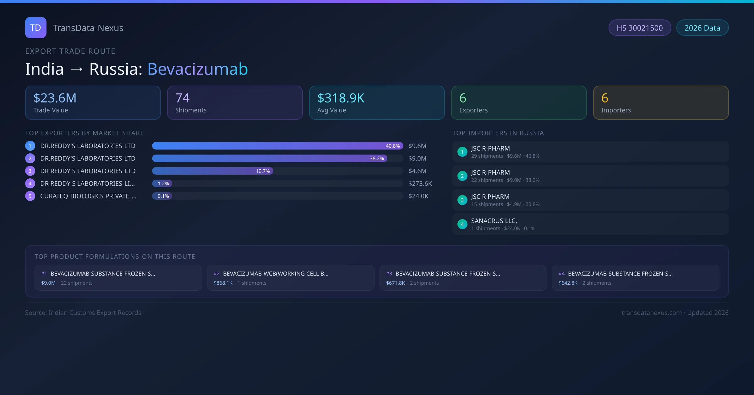 India has recorded 74 verified shipments of Bevacizumab exported to Russia, representing a combined trade value of $23.6M USD. This corridor is served by 6 active Indian exporters, with an average shipment value of $318.9K USD. The leading Indian exporter is DR.REDDY'S LABORATORIES LTD, which accounts for 41% of total export value with 30 shipments worth $9.6M USD. On the buying side, JSC R-PHARM is the largest importer in Russia with $9.6M USD in purchases. The top 3 suppliers — DR.REDDY'S LABORATORIES LTD, DR.REDDY'S LABORATORIES LTD , DR REDDY S LABORATORIES LTD — together control 99% of total trade value on this route. All data sourced from Indian Customs (DGFT) shipping bill records. Values reported in FOB USD.