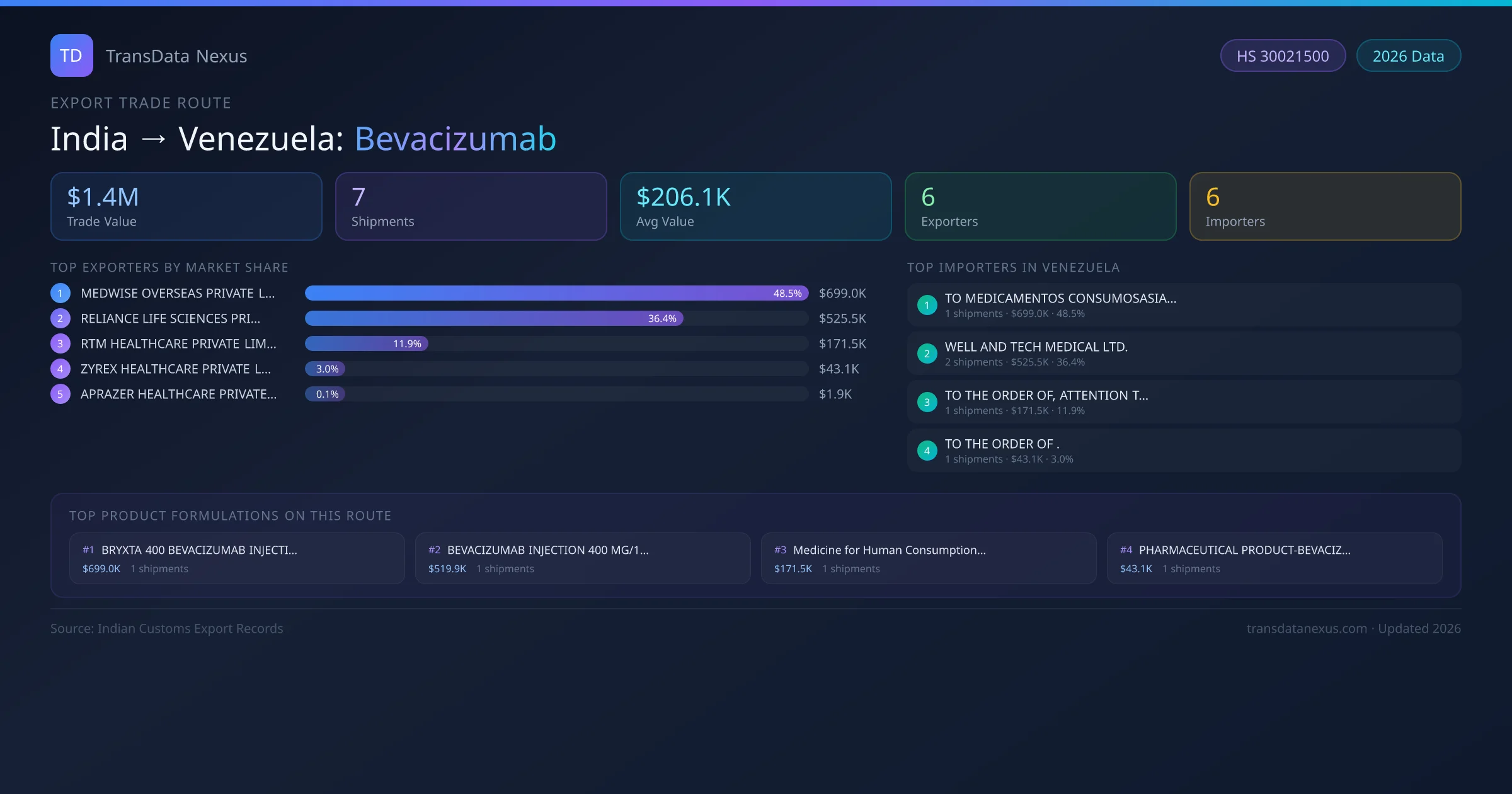 India exports Bevacizumab to Venezuela worth approximately $1.4M USD across 7 recorded shipments. The average value per shipment is $206.1K USD.