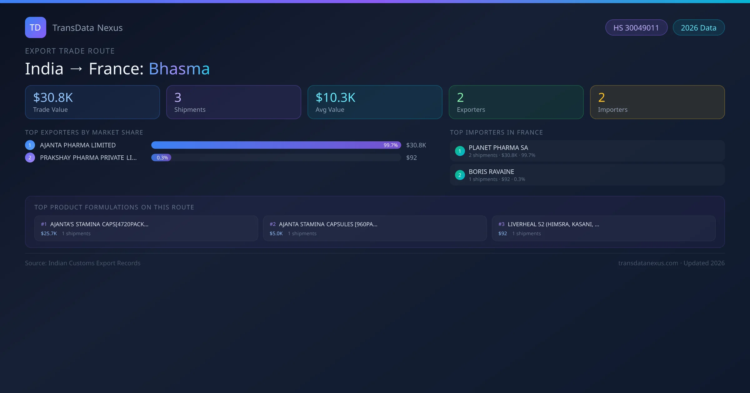 India has recorded 3 verified shipments of Bhasma exported to France, representing a combined trade value of $30.8K USD. This corridor is served by 2 active Indian exporters, with an average shipment value of $10.3K USD. The leading Indian exporter is AJANTA PHARMA LIMITED, which accounts for 100% of total export value with 2 shipments worth $30.8K USD. On the buying side, PLANET PHARMA SA is the largest importer in France with $30.8K USD in purchases. All data sourced from Indian Customs (DGFT) shipping bill records. Values reported in FOB USD.
