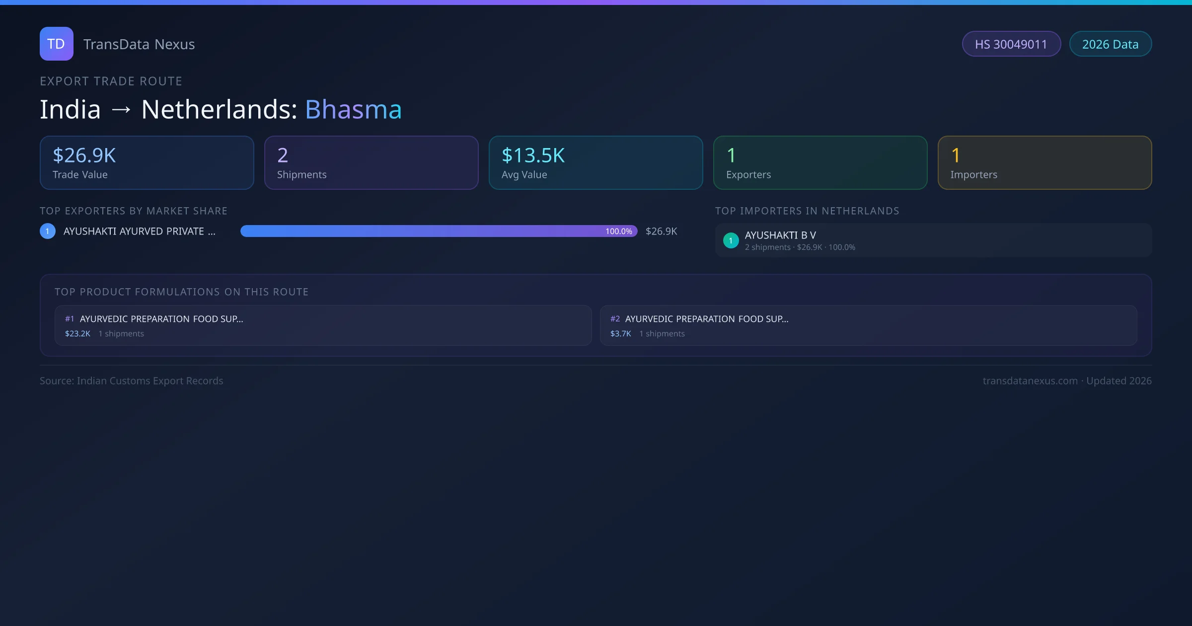 The India to Netherlands Bhasma corridor is one of India's established pharmaceutical export routes, with 2 shipments documented worth a combined $26.9K USD. The route is dominated by AYUSHAKTI AYURVED PRIVATE LIMITED, which alone accounts for roughly 100% of all export value, reflecting the consolidated nature of India's bhasma manufacturing sector.