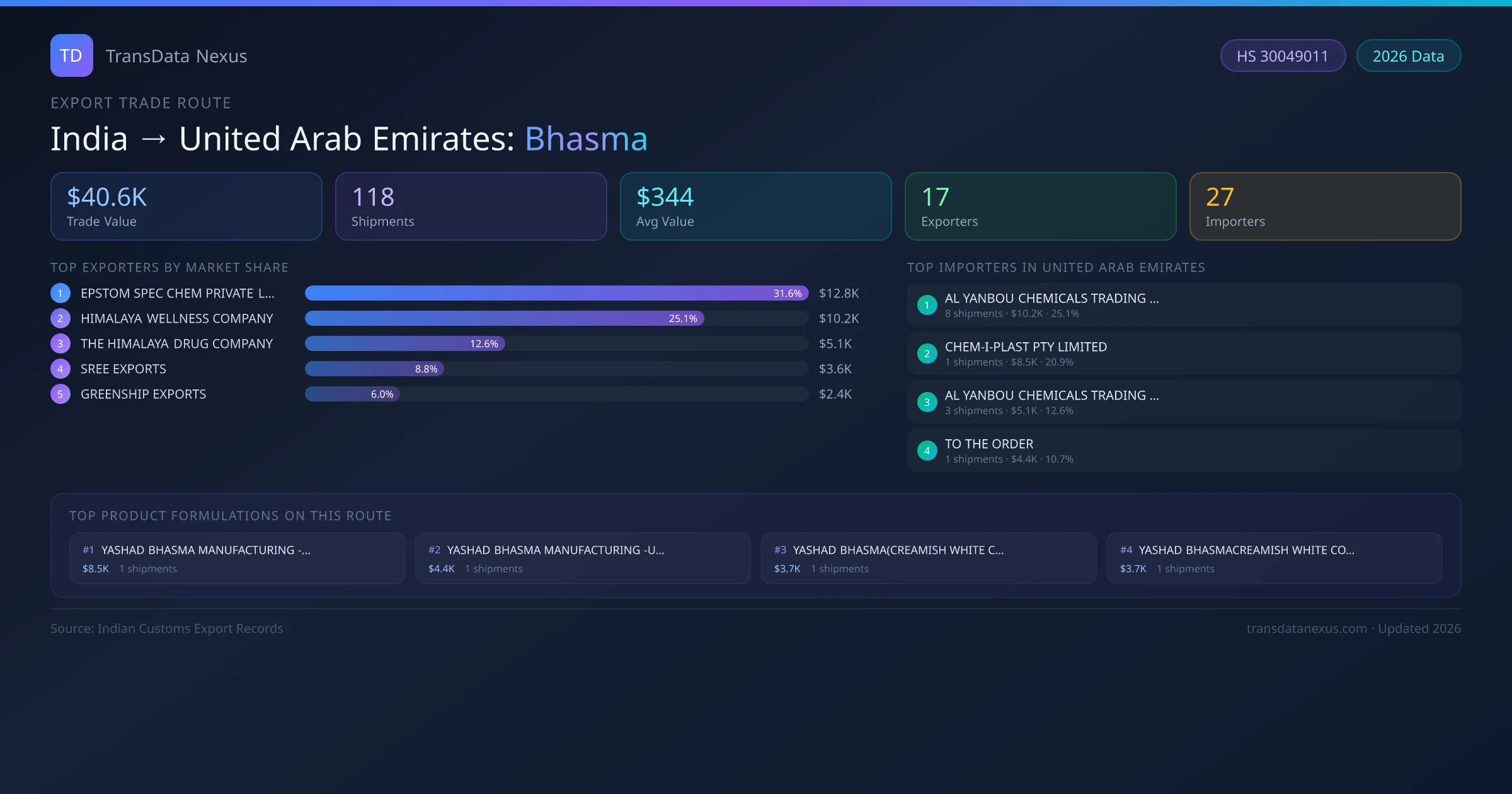 India has recorded 118 verified shipments of Bhasma exported to United Arab Emirates, representing a combined trade value of $40.6K USD. This corridor is served by 17 active Indian exporters, with an average shipment value of $344 USD. The leading Indian exporter is EPSTOM SPEC CHEM PRIVATE LIMITED, which accounts for 32% of total export value with 2 shipments worth $12.8K USD. On the buying side, AL YANBOU CHEMICALS TRADING CO.LLC is the largest importer in United Arab Emirates with $10.2K USD in purchases. The top 3 suppliers — EPSTOM SPEC CHEM PRIVATE LIMITED, HIMALAYA WELLNESS COMPANY, THE HIMALAYA DRUG COMPANY — together control 69% of total trade value on this route. All data sourced from Indian Customs (DGFT) shipping bill records. Values reported in FOB USD.