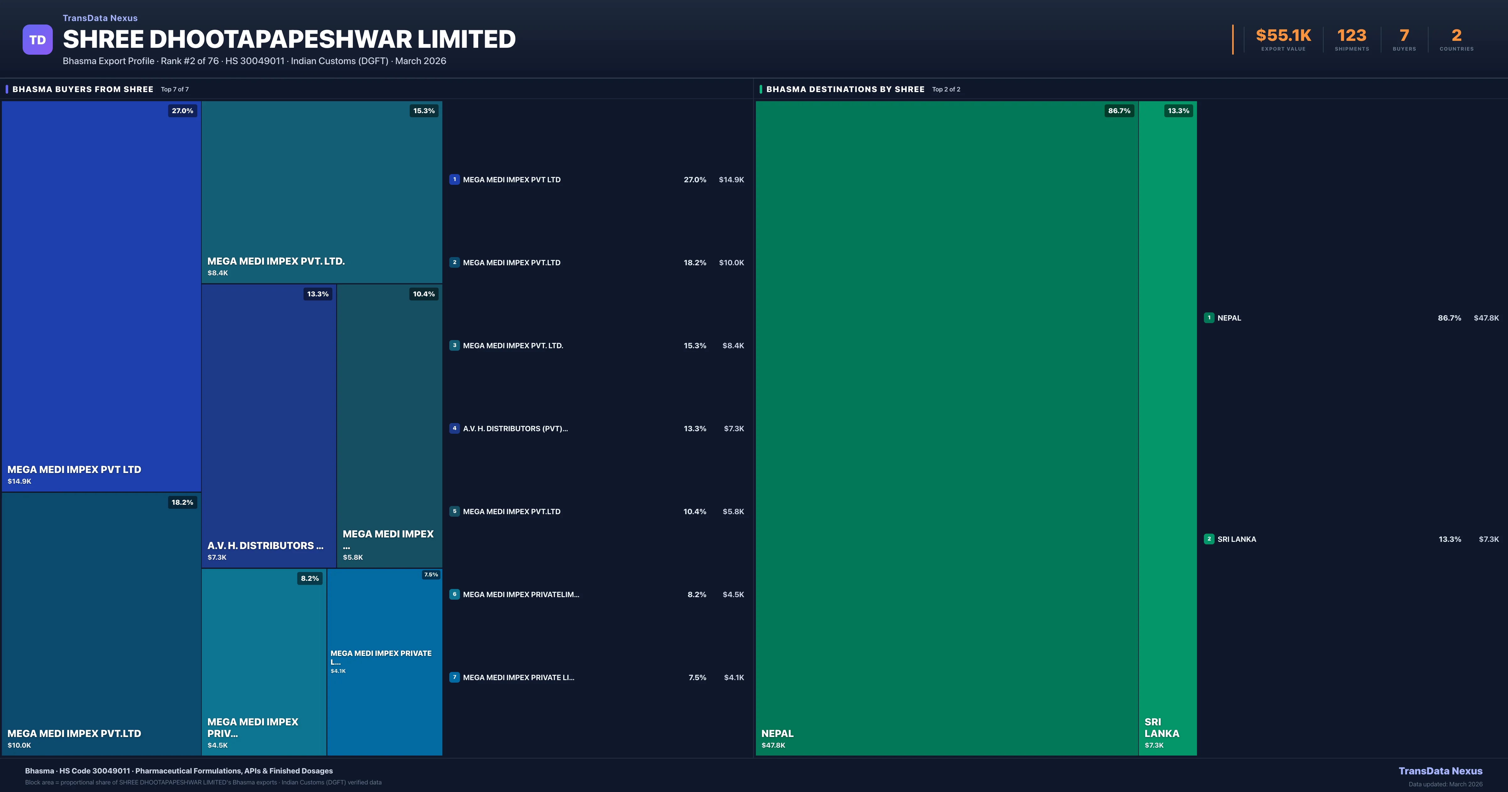 Shree Dhootapapeshwar Limited supplies Bhasma to 7 buyers globally. The largest buyer is MEGA MEDI IMPEX PVT LTD (NEPAL), followed by MEGA MEDI IMPEX PVT.LTD (NEPAL) and MEGA MEDI IMPEX PVT. LTD. (NEPAL). These buyers represent pharmaceutical distributors, hospital groups, and government procurement agencies in their respective markets.