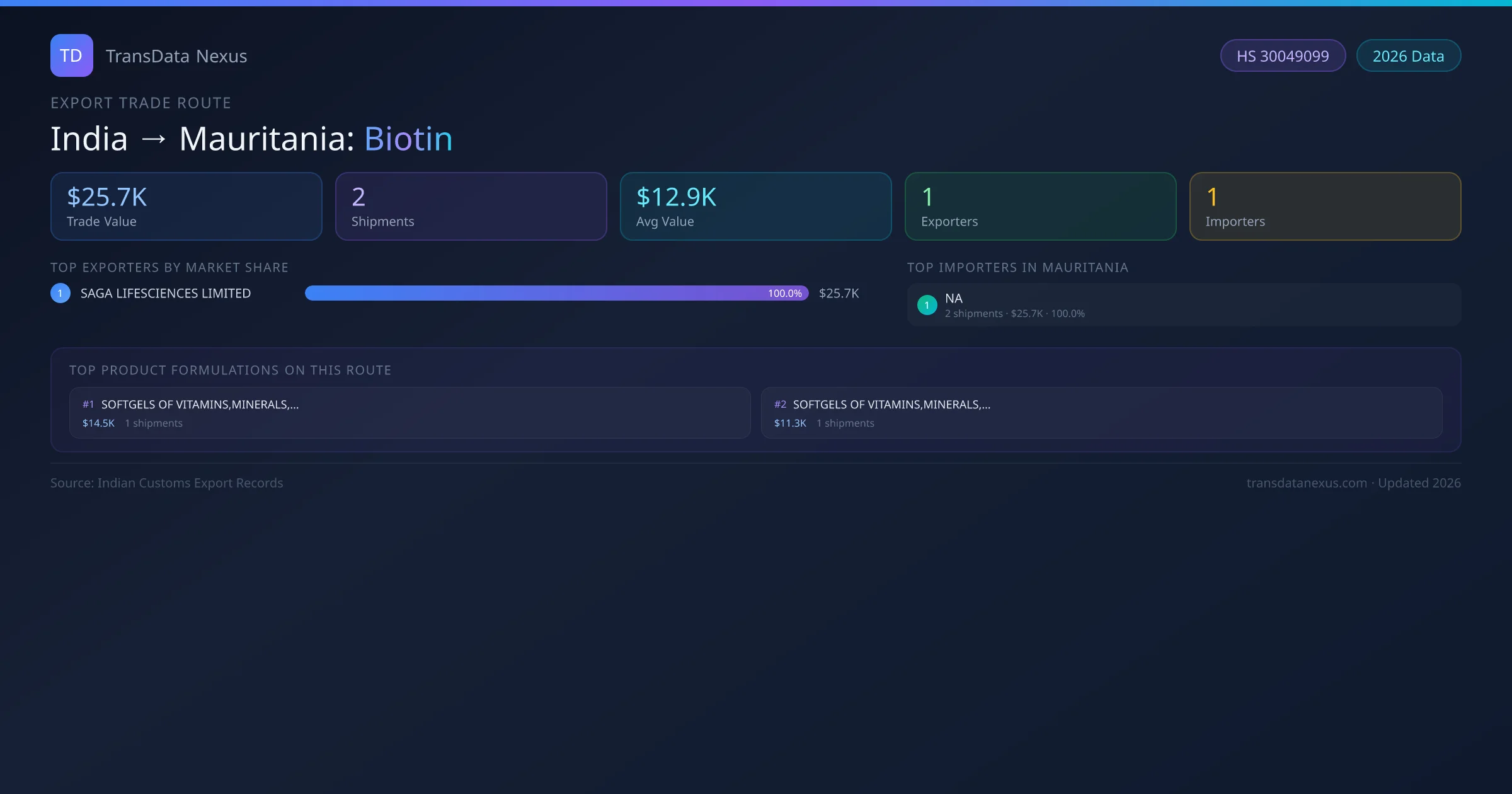 India exports Biotin to Mauritania worth approximately $25.7K USD across 2 recorded shipments. The average value per shipment is $12.9K USD.