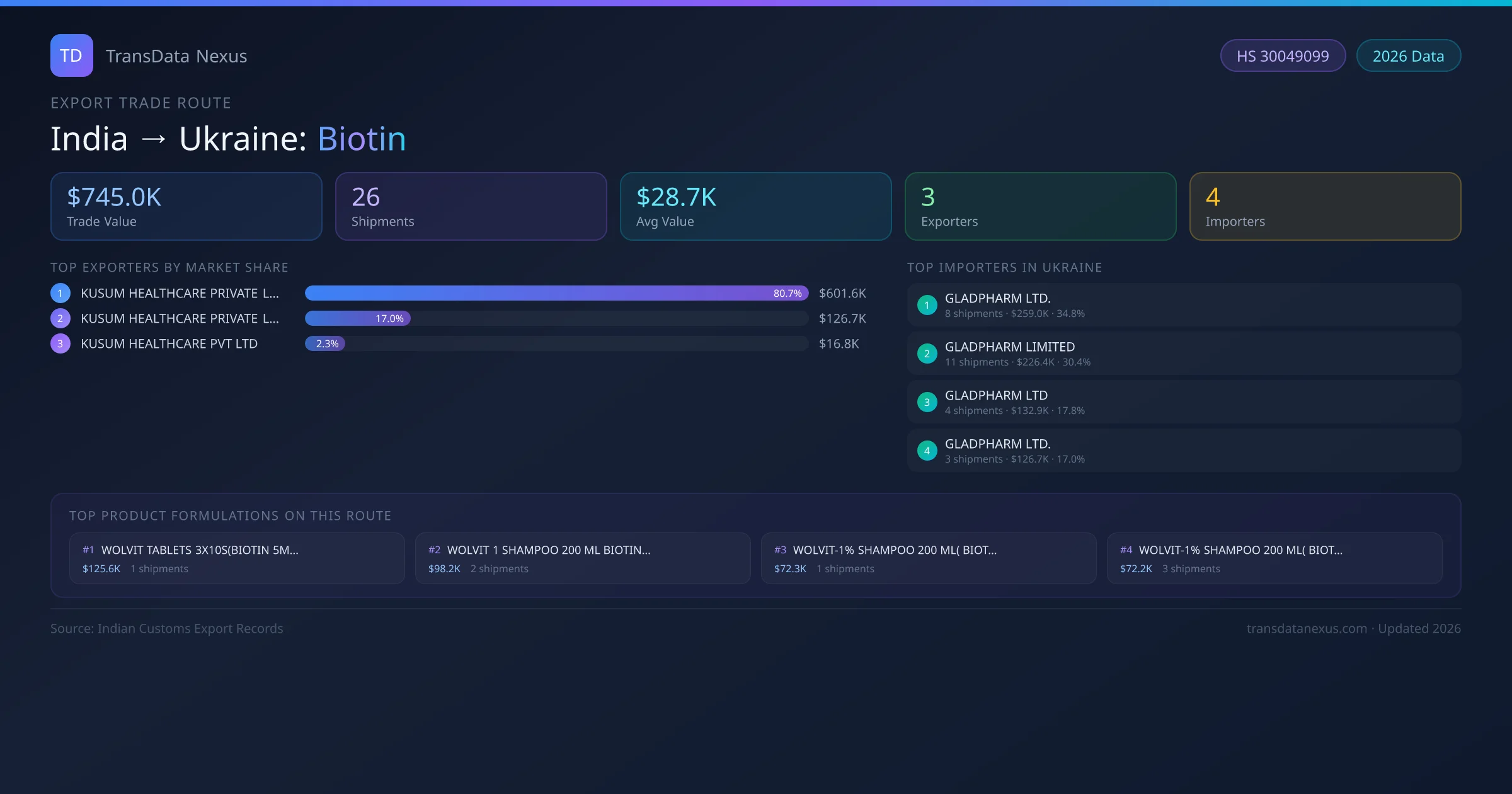 The India to Ukraine Biotin corridor is one of India's established pharmaceutical export routes, with 26 shipments documented worth a combined $745.0K USD. The route is dominated by KUSUM HEALTHCARE PRIVATE LIMITED, which alone accounts for roughly 81% of all export value, reflecting the consolidated nature of India's biotin manufacturing sector.