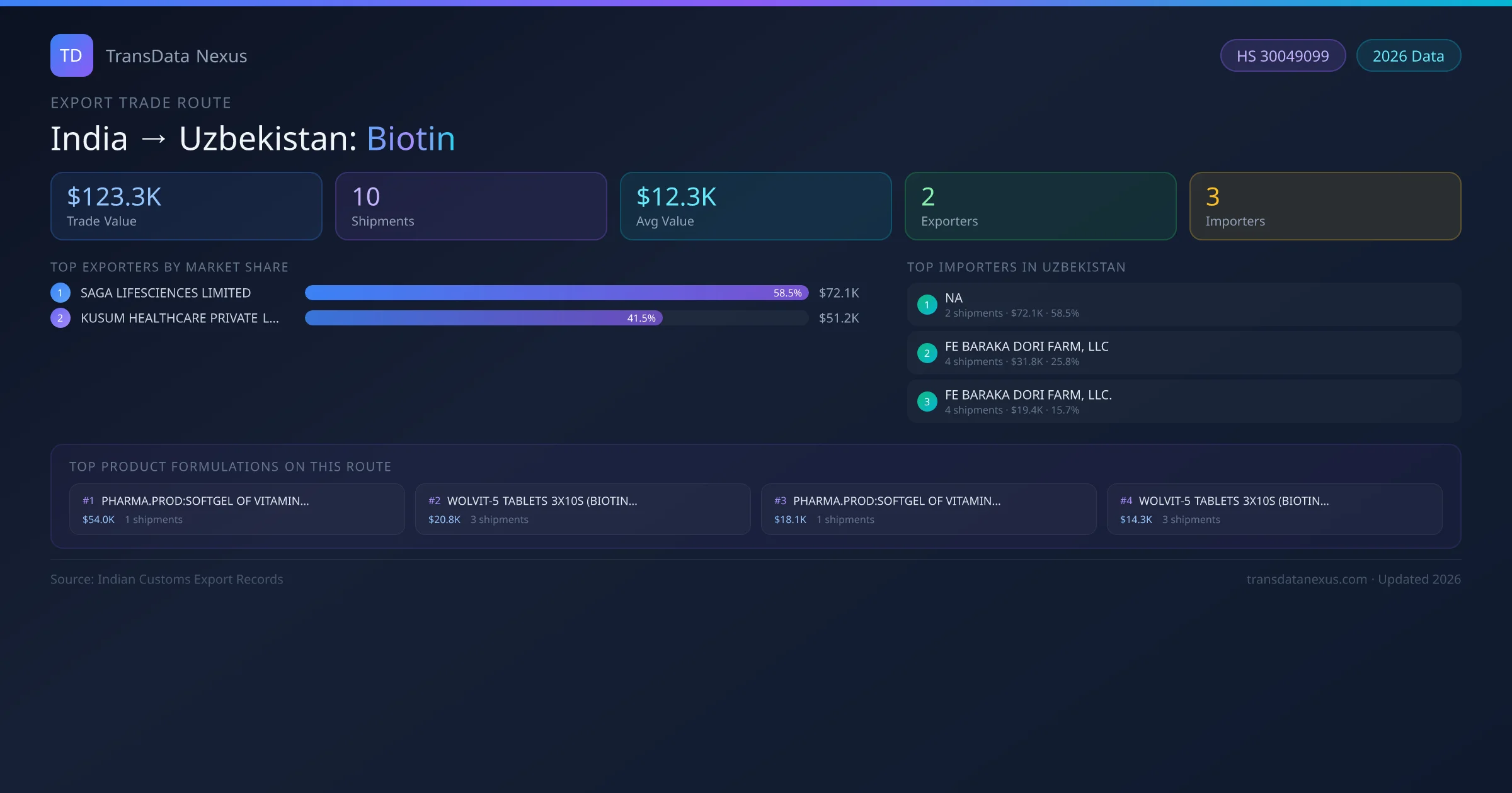 - 1.Route Identification: India to Uzbekistan export trade corridor identified from Indian Customs (DGFT) records for Biotin.