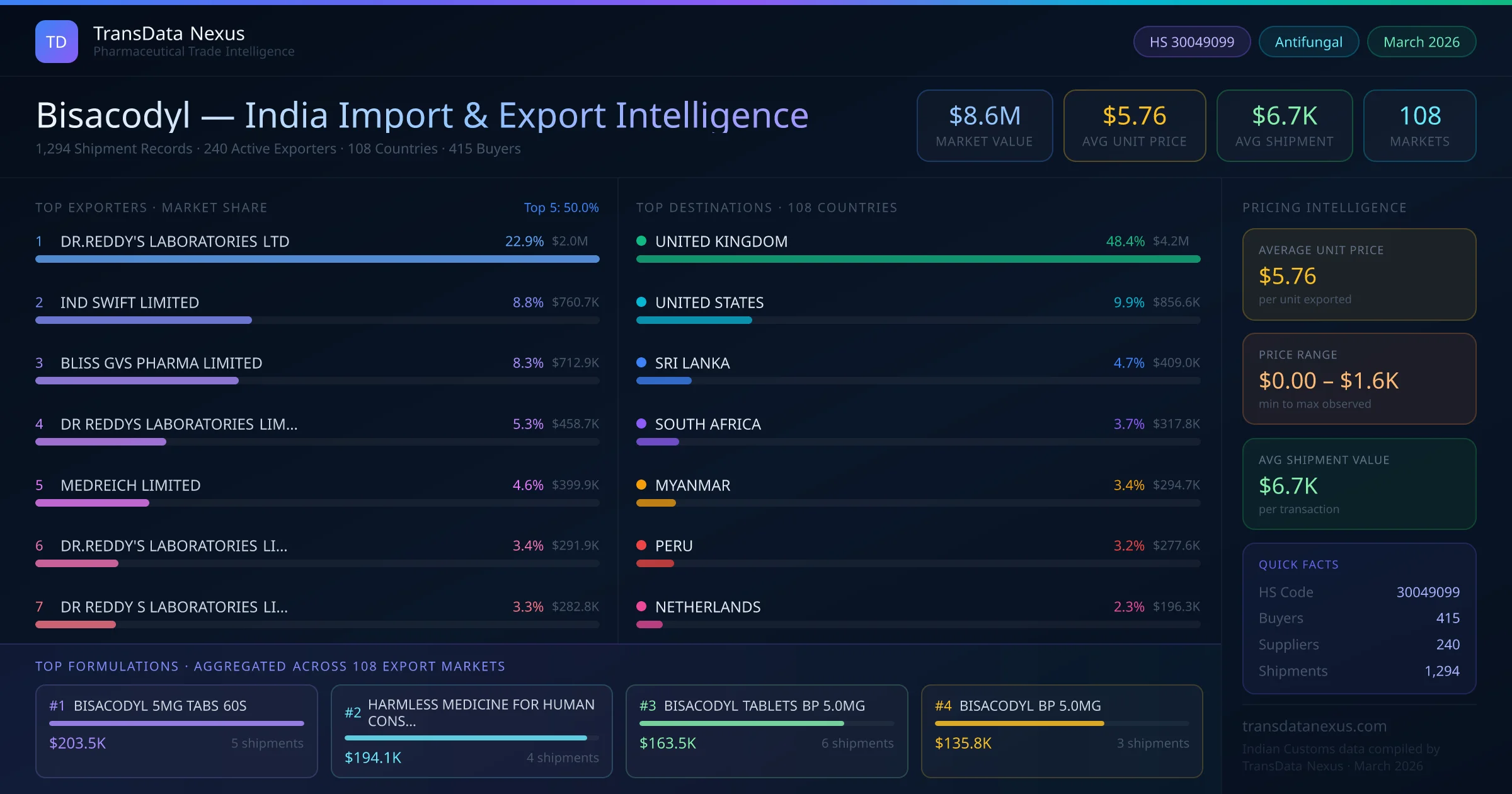 Between 2022 and 2026, India exported $8.6M worth of bisacodyl across 1,294 verified shipments to 108 countries — covering 55% of world markets in the Gastrointestinal segment. The largest destination is UNITED KINGDOM (48.4%). DR.REDDY'S LABORATORIES LTD leads with a 22.9% share. All figures are drawn from Indian Customs (DGFT) shipping bill records spanning four years of trade activity.