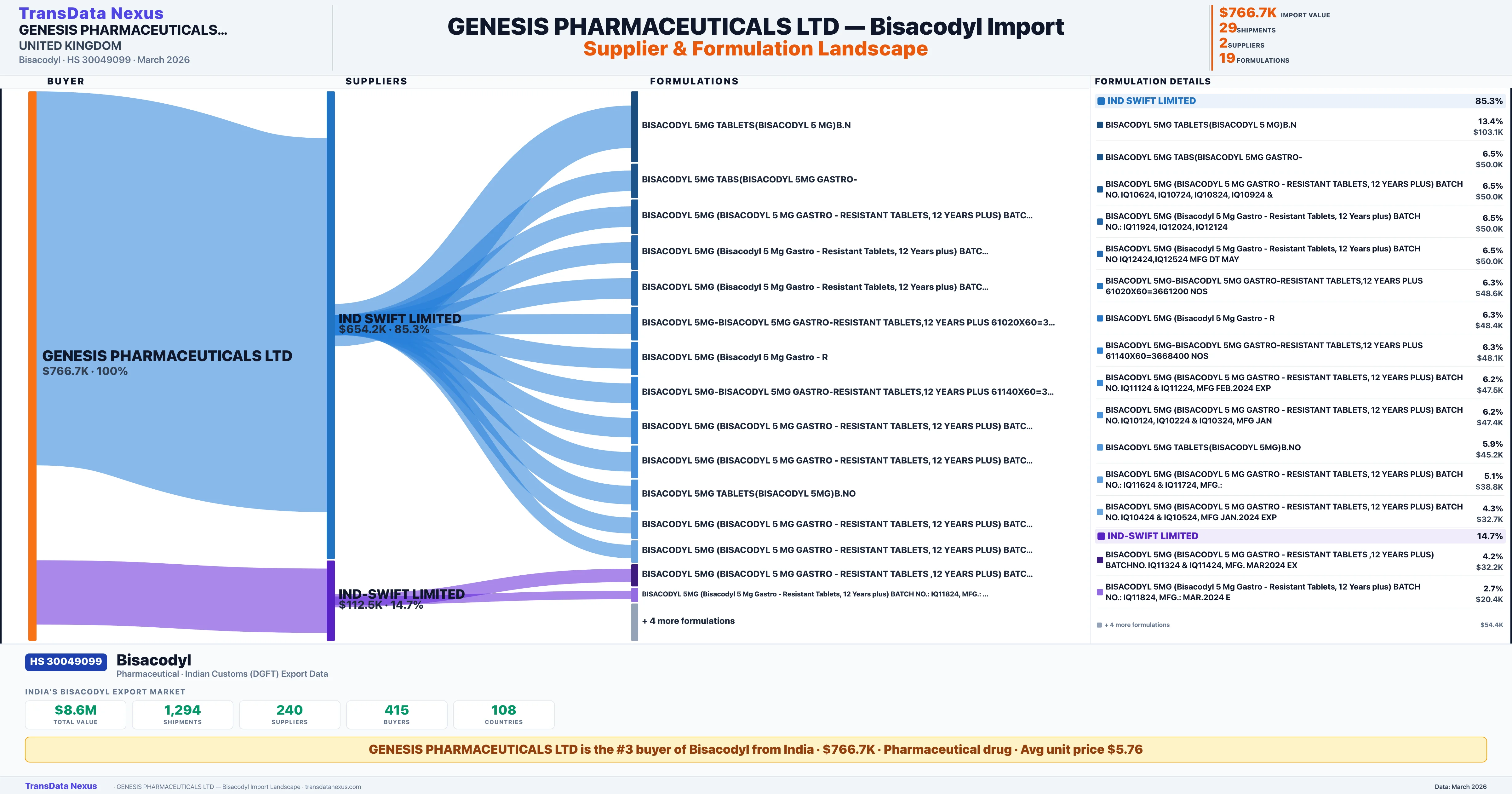 GENESIS PHARMACEUTICALS LTD sources Bisacodyl from 2 verified Indian suppliers: IND SWIFT LIMITED ($654.2K, 85.3%), IND-SWIFT LIMITED ($112.5K, 14.7%). This is based on 29 customs records.