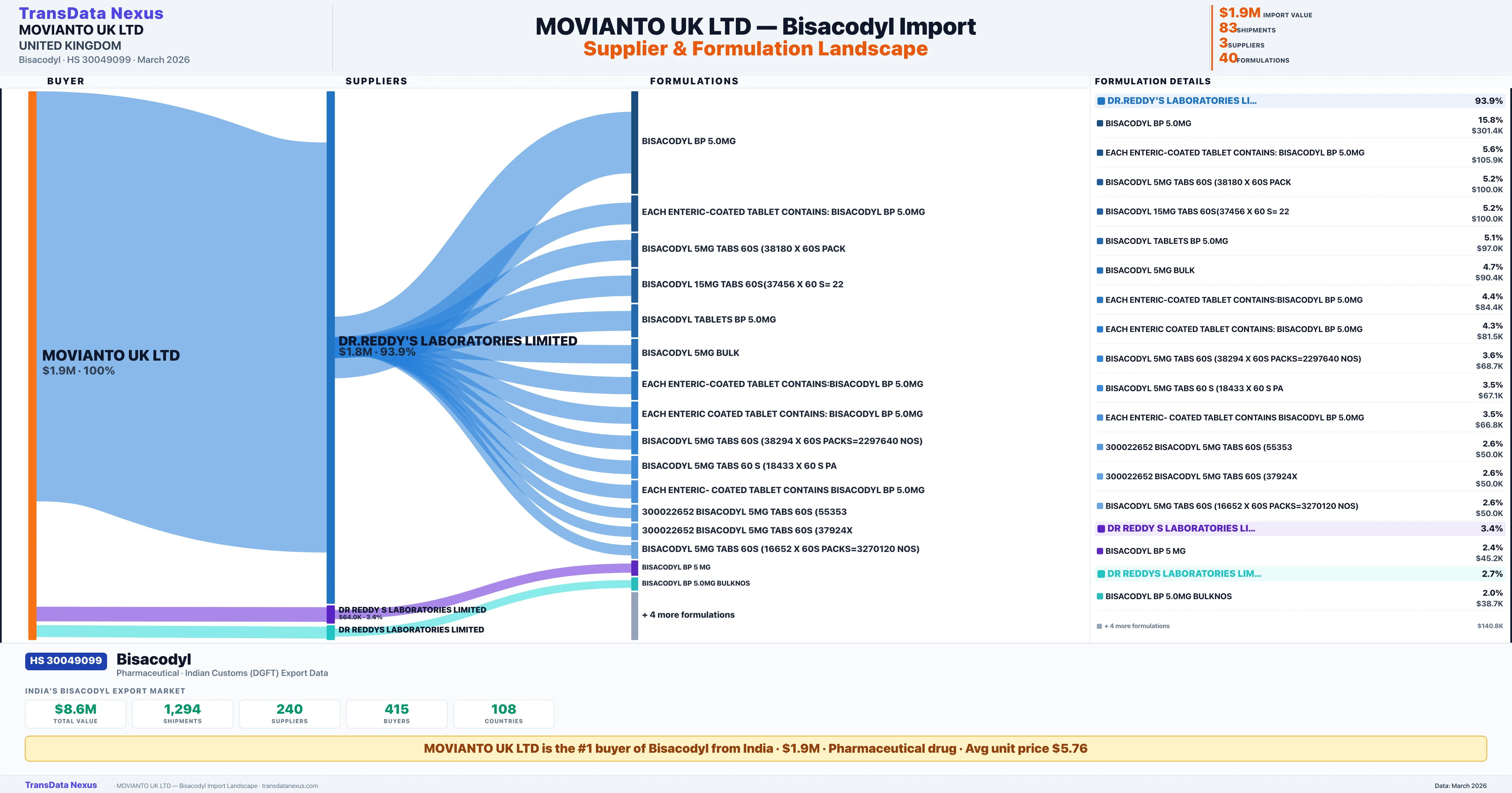 MOVIANTO UK LTD sources Bisacodyl from 3 verified Indian suppliers: DR.REDDY'S LABORATORIES LIMITED ($1.8M, 93.9%), DR REDDY S LABORATORIES LIMITED ($64.0K, 3.4%), DR REDDYS LABORATORIES LIMITED ($51.9K, 2.7%). This is based on 83 customs records.