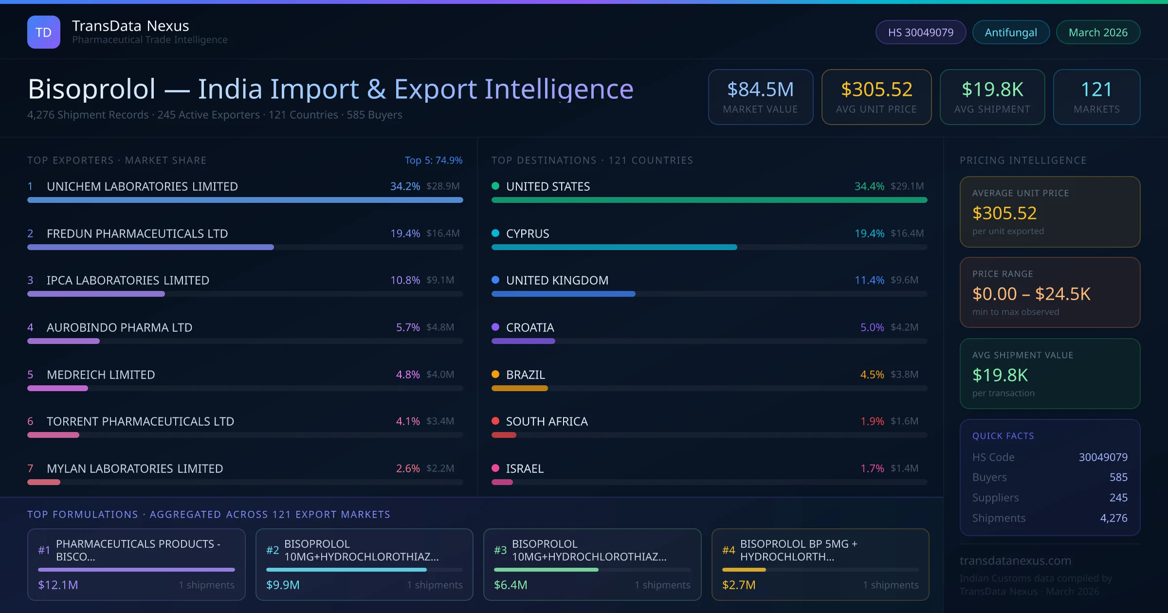 The primary HS code for bisoprolol exports from India is 30049079. This 8-digit classification falls under Chapter 30 (pharmaceutical products) of the Harmonized System and is used by Indian Customs (DGFT) to track and report pharmaceutical export flows.