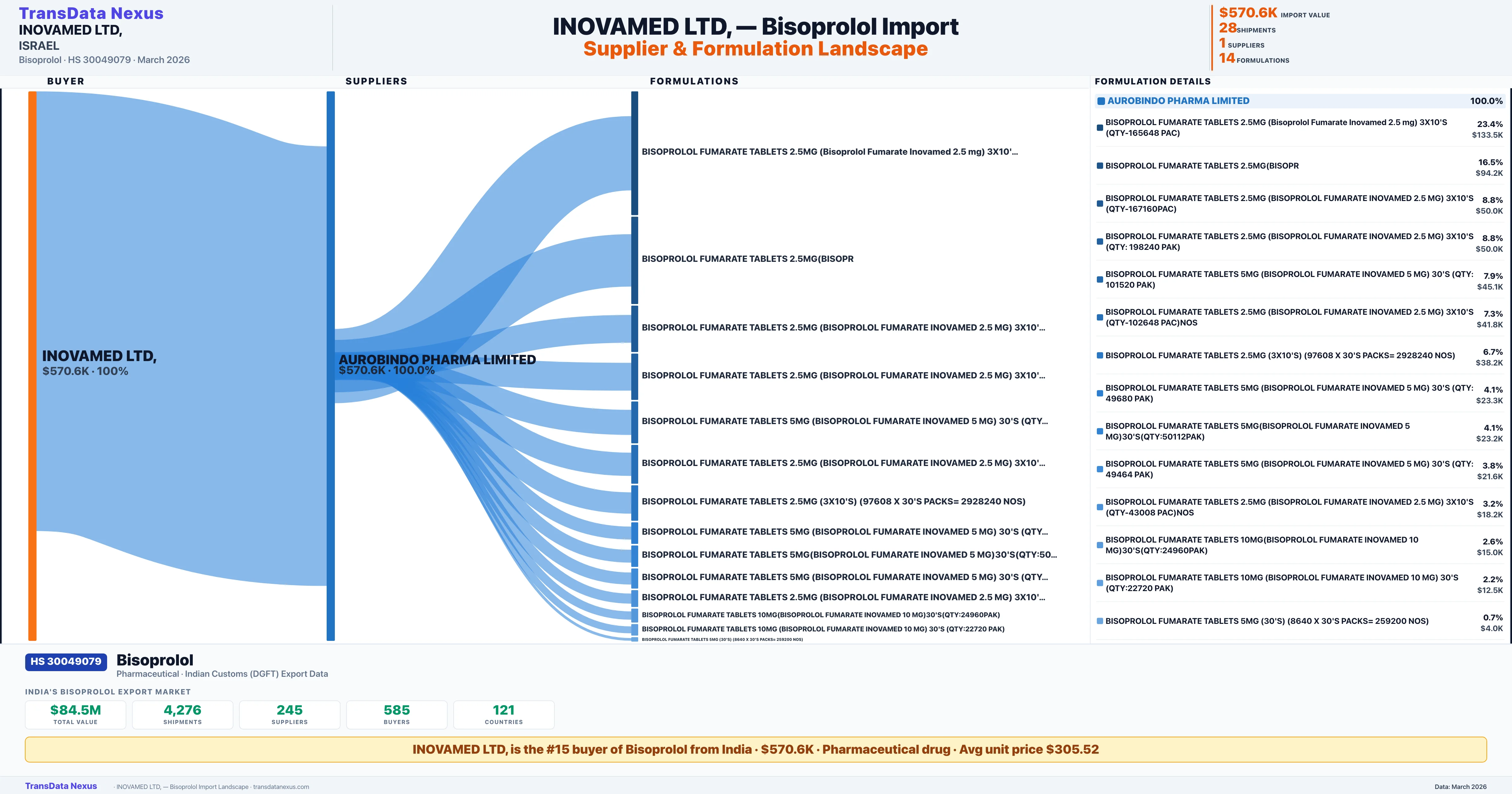 INOVAMED LTD, sources Bisoprolol from 1 verified Indian supplier: AUROBINDO PHARMA LIMITED ($570.6K, 100.0%). This is based on 28 customs records.