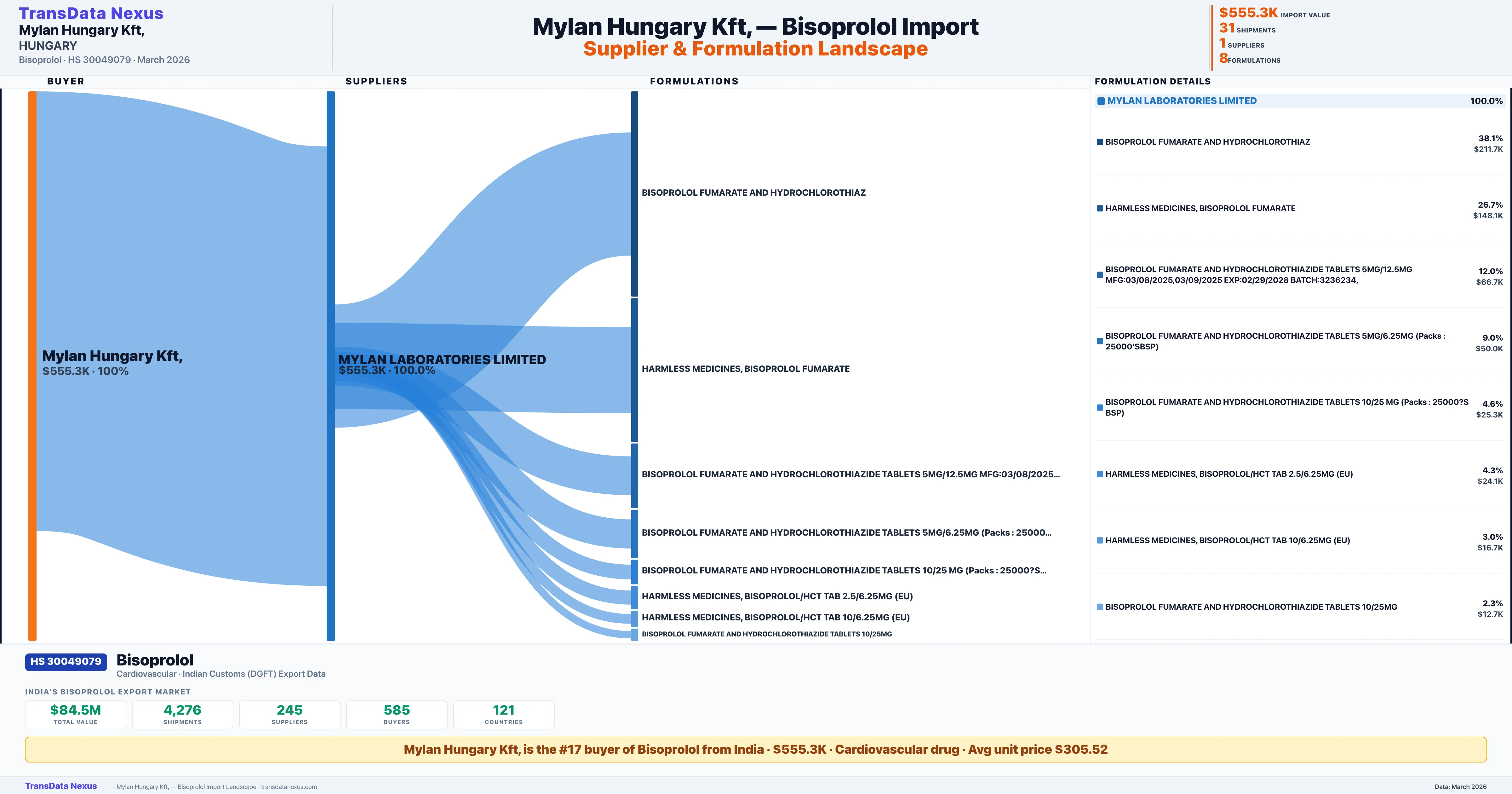 MYLAN HUNGARY KFT, sources Bisoprolol from 1 verified Indian supplier: MYLAN LABORATORIES LIMITED ($555.3K, 100.0%). This is based on 31 customs records.
