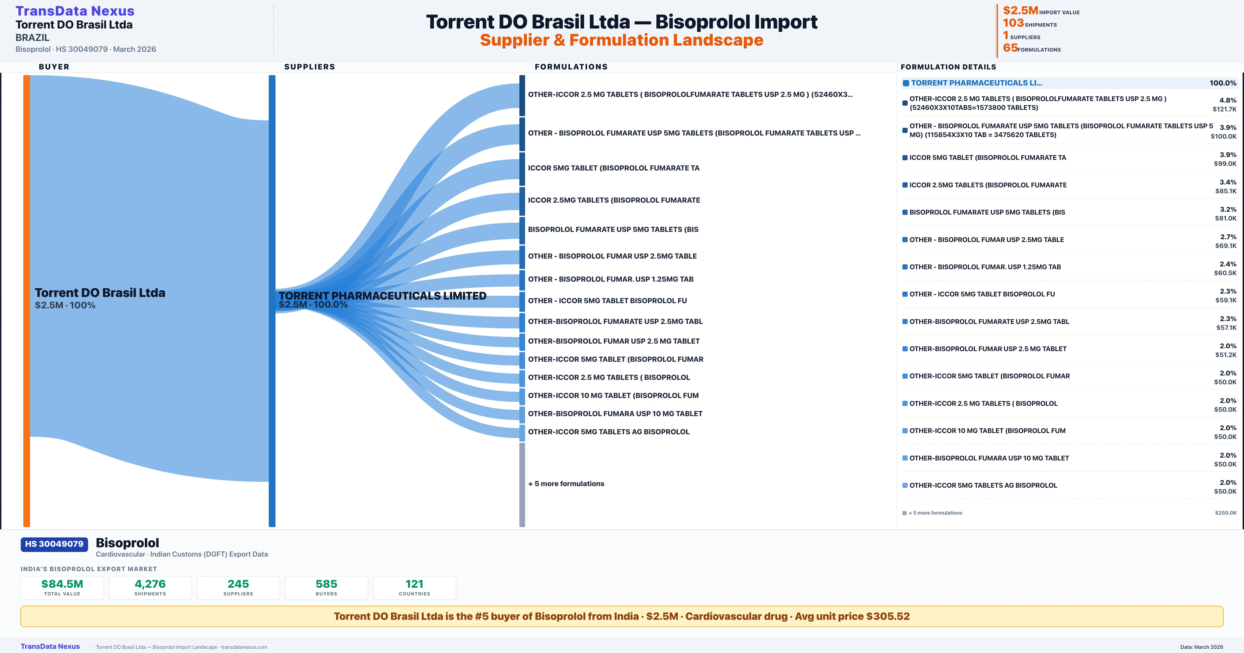 TORRENT DO BRASIL LTDA sources Bisoprolol from 1 verified Indian supplier: TORRENT PHARMACEUTICALS LIMITED ($2.5M, 100.0%). This is based on 103 customs records.