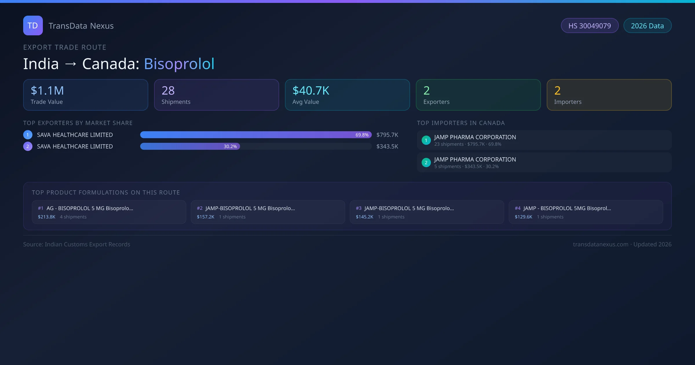 - 1.Route Identification: India to Canada export trade corridor identified from Indian Customs (DGFT) records for Bisoprolol.
