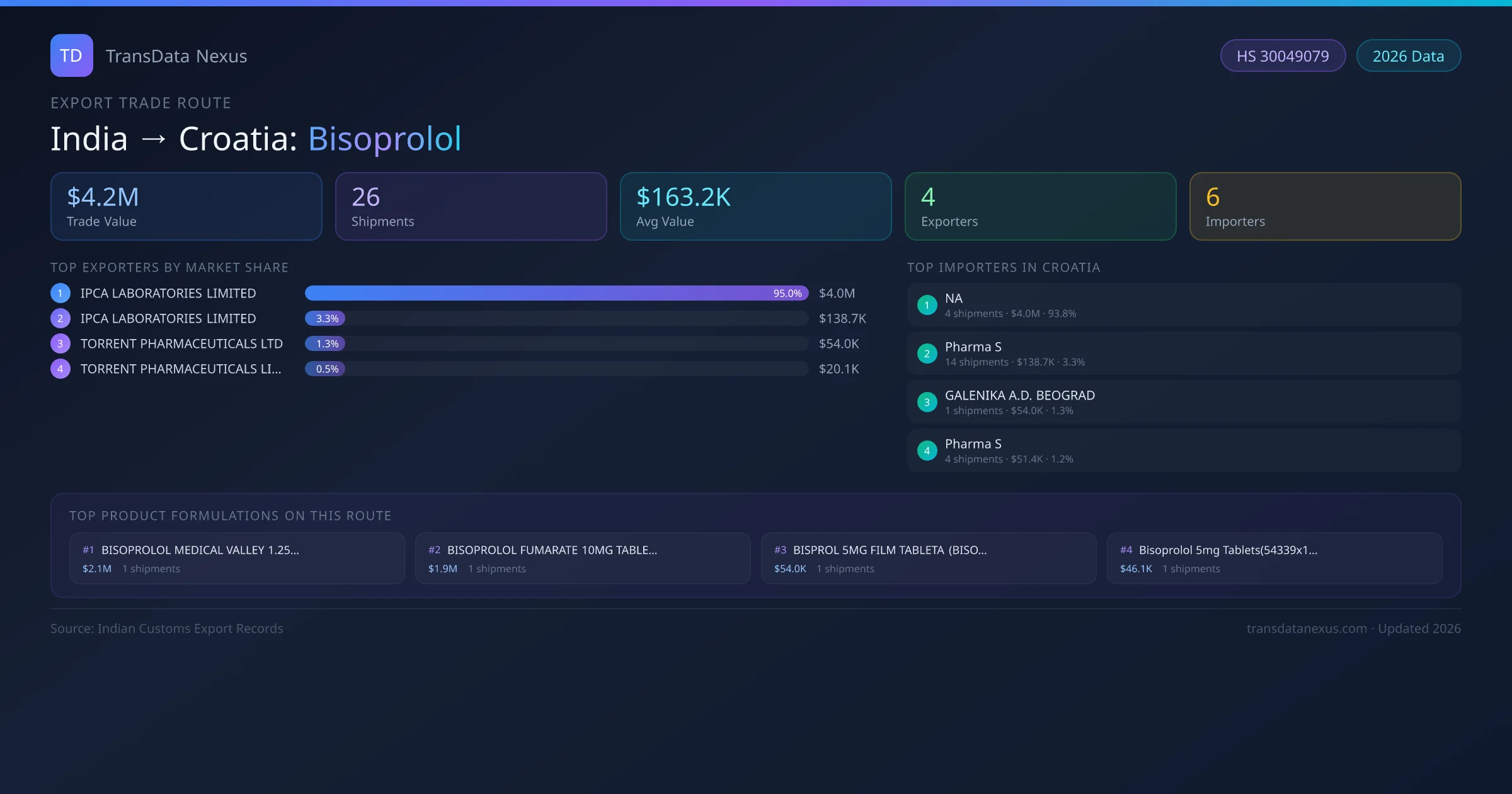 India exports Bisoprolol to Croatia worth approximately $4.2M USD across 26 recorded shipments. The average value per shipment is $163.2K USD.