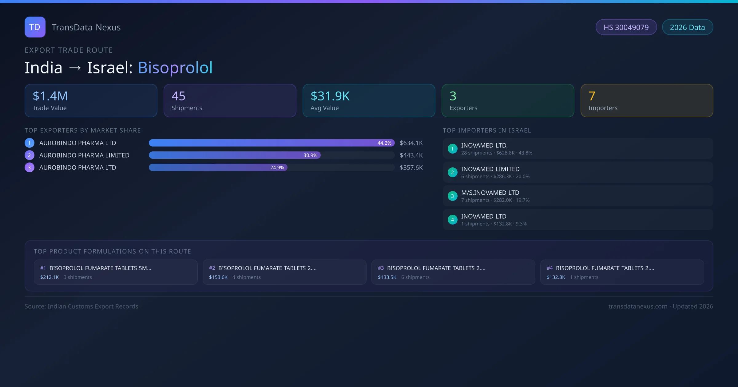 India exports Bisoprolol to Israel worth approximately $1.4M USD across 45 recorded shipments. The average value per shipment is $31.9K USD.