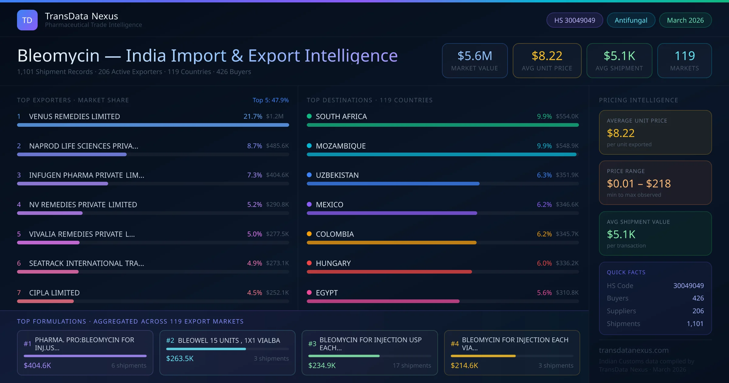 Between 2022 and 2026, India exported $5.6M worth of bleomycin across 1,101 verified shipments to 119 countries — covering 61% of world markets in the Advanced Oncology segment. The largest destination is SOUTH AFRICA (9.9%). VENUS REMEDIES LIMITED leads with a 21.7% share. All figures are drawn from Indian Customs (DGFT) shipping bill records spanning four years of trade activity.