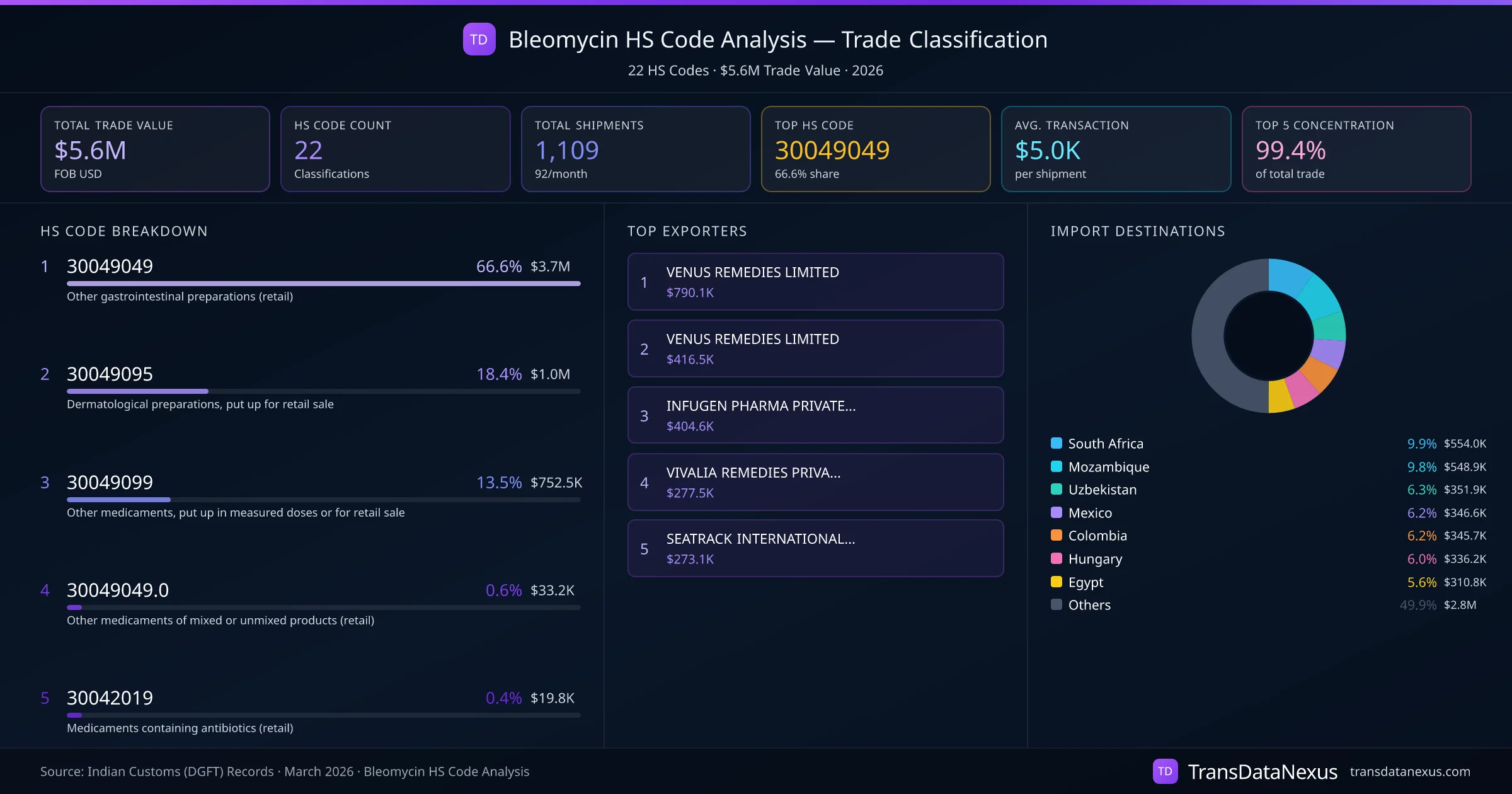 India exports Bleomycin under 22 distinct HS code classifications, representing a total trade value of $5.6M across 1,109 shipments. The dominant classification is HS 30049049 (Other gastrointestinal preparations (retail)), accounting for 66.6% of all Bleomycin trade at $3.7M. HS 30049095 (Dermatological preparations, put up for retail sale) follows at 18.4% ($1.0M). The top 5 HS codes together account for 99.4% of total Bleomycin trade from India. The average transaction value is $5033. Key importing markets include South Africa, Mozambique, Uzbekistan. Leading exporters include VENUS REMEDIES LIMITED and VENUS REMEDIES LIMITED . Data sourced from Indian Customs (DGFT) shipping bill records.
