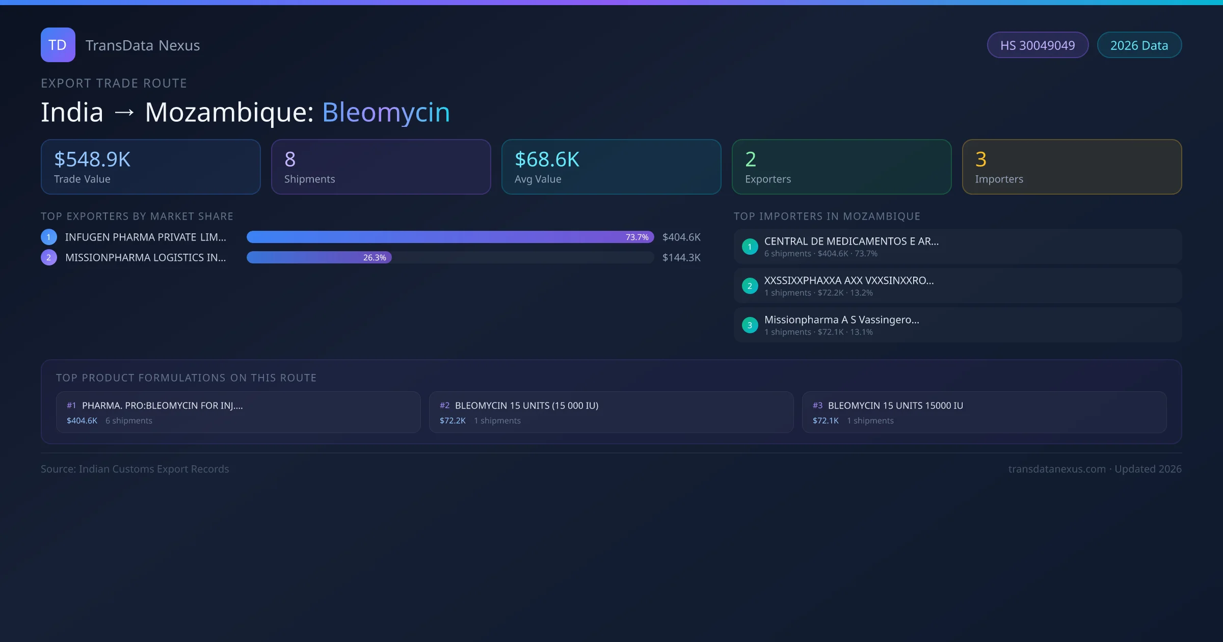 - 1.Route Identification: India to Mozambique export trade corridor identified from Indian Customs (DGFT) records for Bleomycin.
