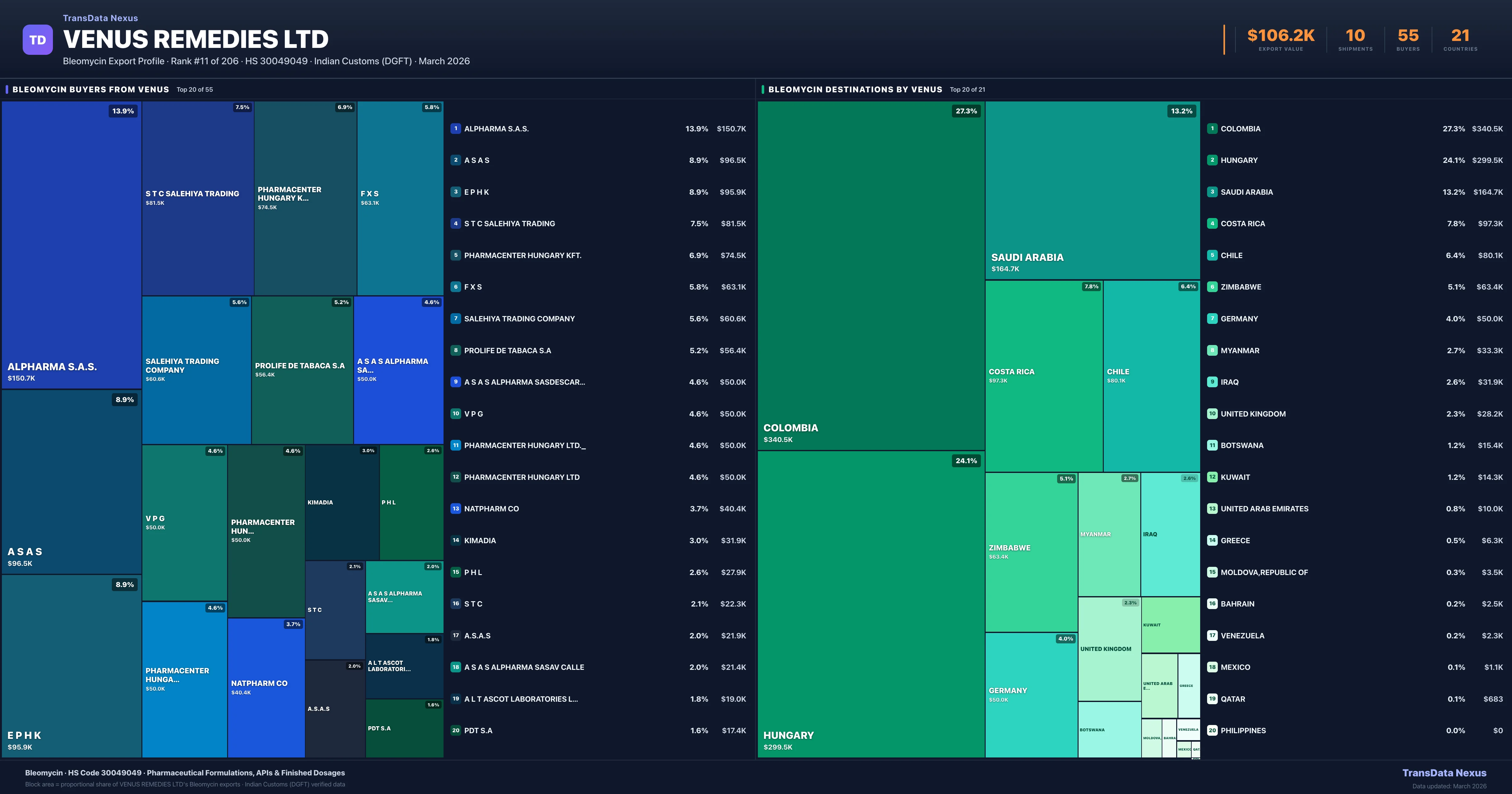 Venus Remedies Ltd β Bleomycin Export Profile: Buyers & Destinations