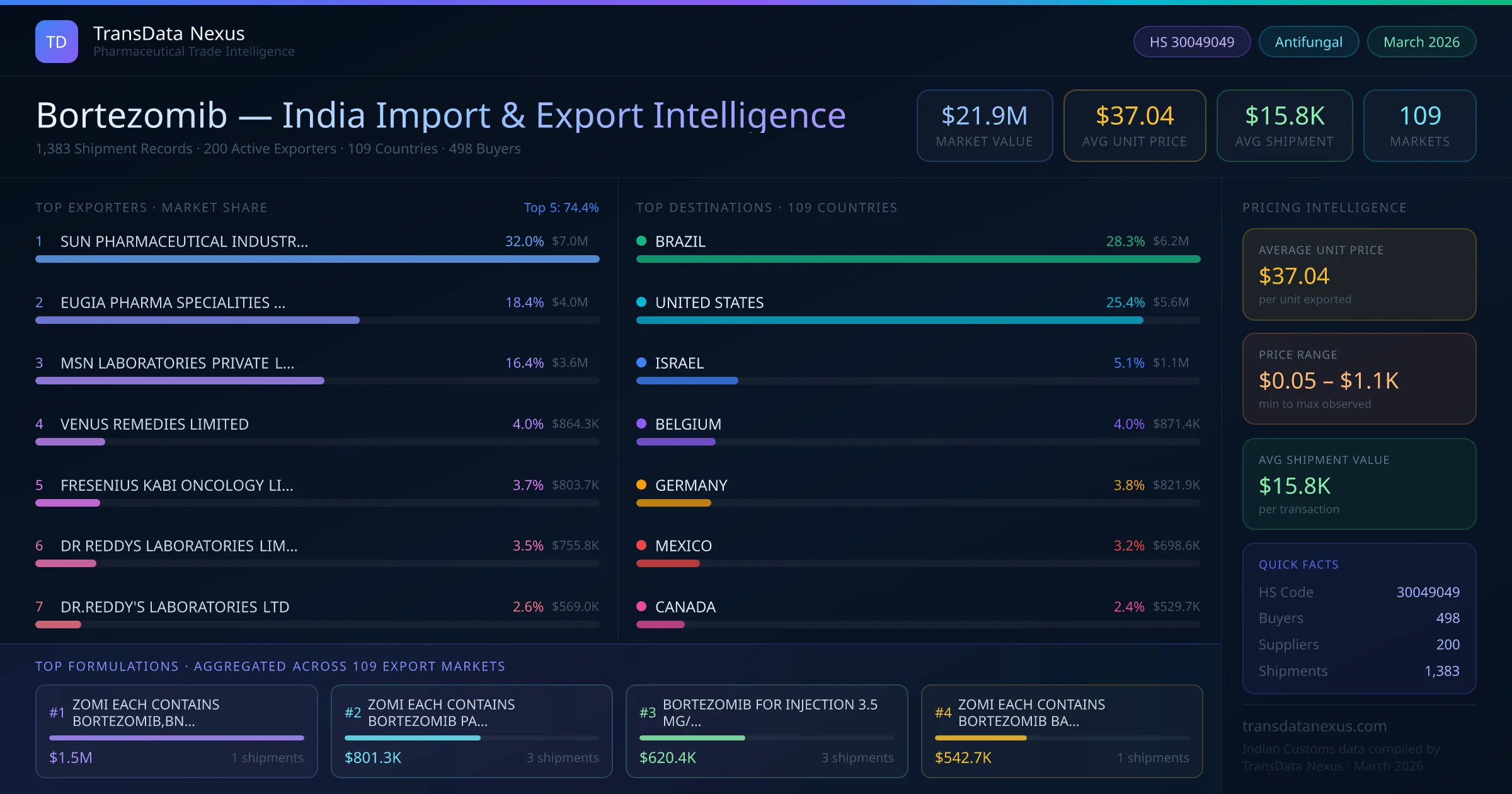 Between 2022 and 2026, India exported $21.9M worth of bortezomib across 1,383 verified shipments to 109 countries — covering 56% of world markets in the Advanced Oncology segment. The largest destination is BRAZIL (28.3%). SUN PHARMACEUTICAL INDUSTRIES LIMITED leads with a 32.0% share. All figures are drawn from Indian Customs (DGFT) shipping bill records spanning four years of trade activity.