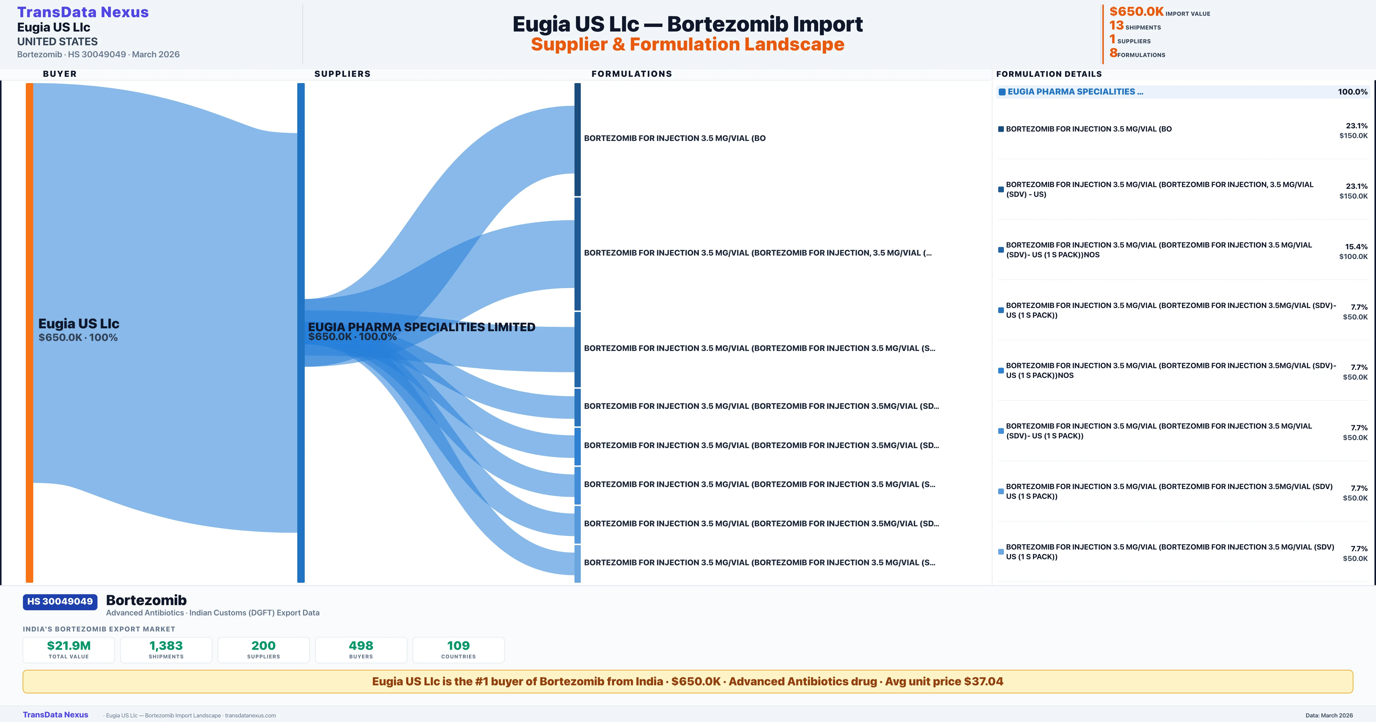 Access order-level details, pricing data, supplier connections, and competitive analysis for EUGIA US LLC,'s Bortezomib imports. TransData Nexus provides verified Indian Customs (DGFT) data trusted by pharmaceutical trade professionals worldwide.