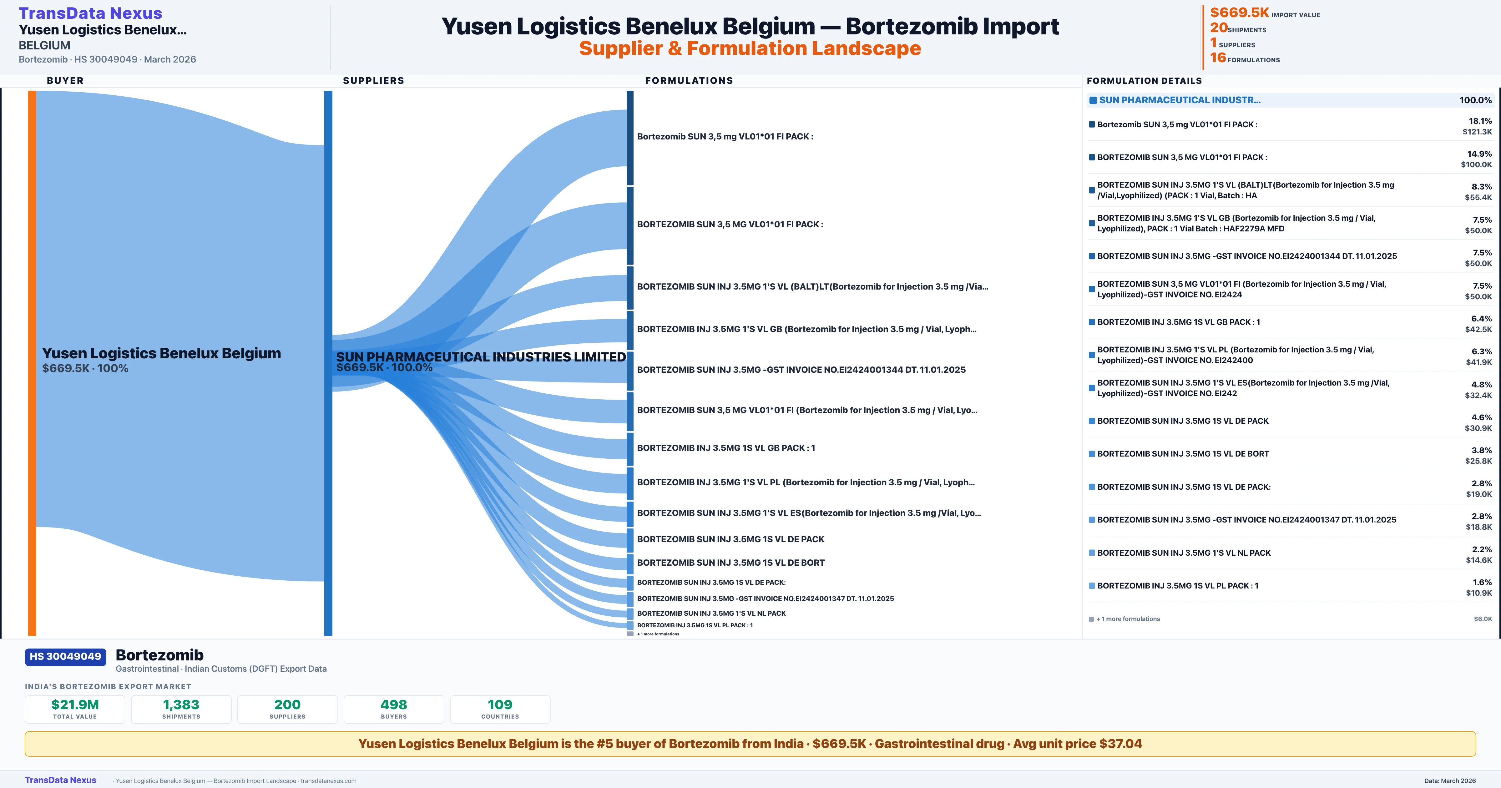 YUSEN LOGISTICS BENELUX BELGIUM sources Bortezomib from 1 verified Indian supplier: SUN PHARMACEUTICAL INDUSTRIES LIMITED ($669.5K, 100.0%). This is based on 20 customs records.