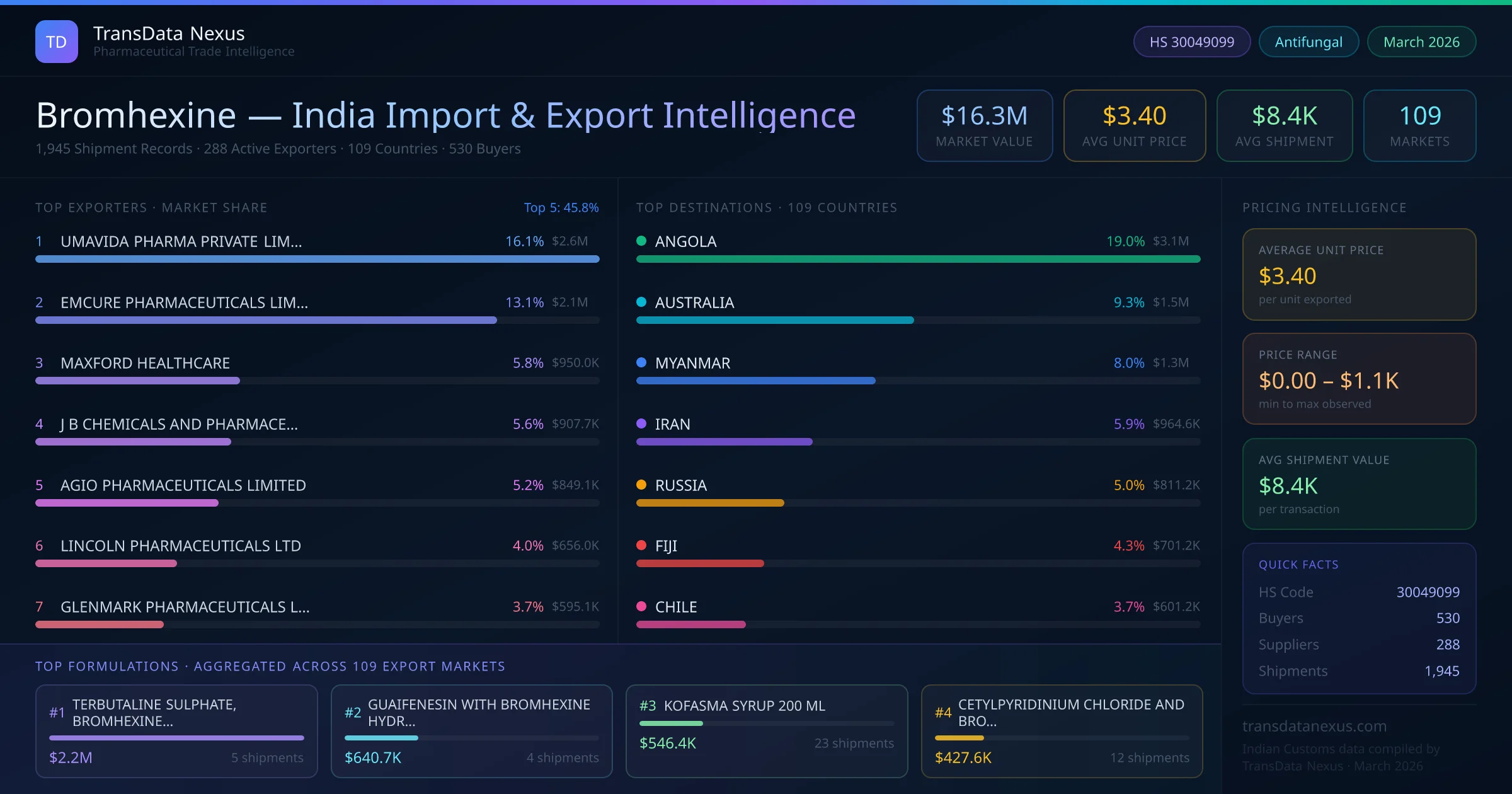 Between 2022 and 2026, India exported $16.3M worth of bromhexine across 1,945 verified shipments to 109 countries — covering 56% of world markets in the Respiratory & OTC segment. The largest destination is ANGOLA (19.0%). UMAVIDA PHARMA PRIVATE LIMITED leads with a 16.1% share. All figures are drawn from Indian Customs (DGFT) shipping bill records spanning four years of trade activity.