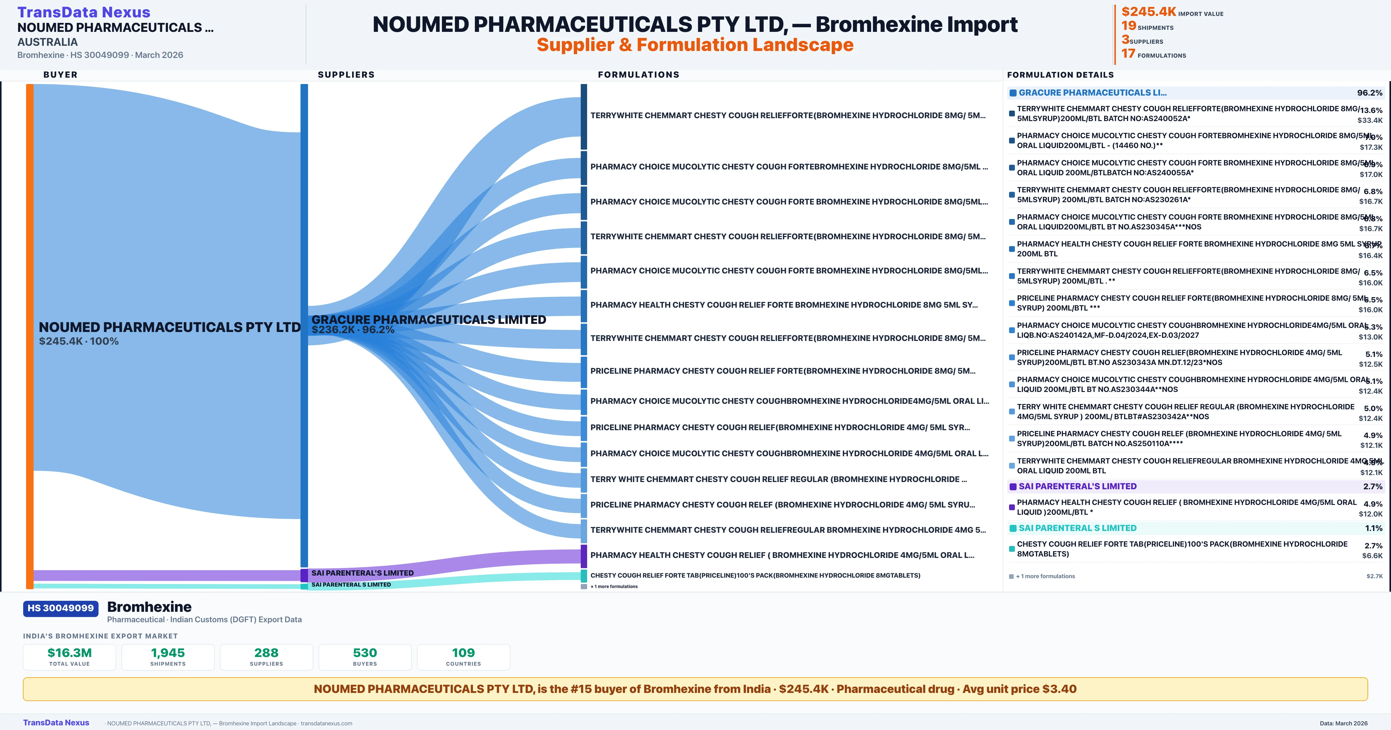 NOUMED PHARMACEUTICALS PTY LTD, sources Bromhexine from 3 verified Indian suppliers: GRACURE PHARMACEUTICALS LIMITED ($236.2K, 96.2%), SAI PARENTERAL'S LIMITED ($6.6K, 2.7%), SAI PARENTERAL S LIMITED ($2.7K, 1.1%). This is based on 19 customs records.