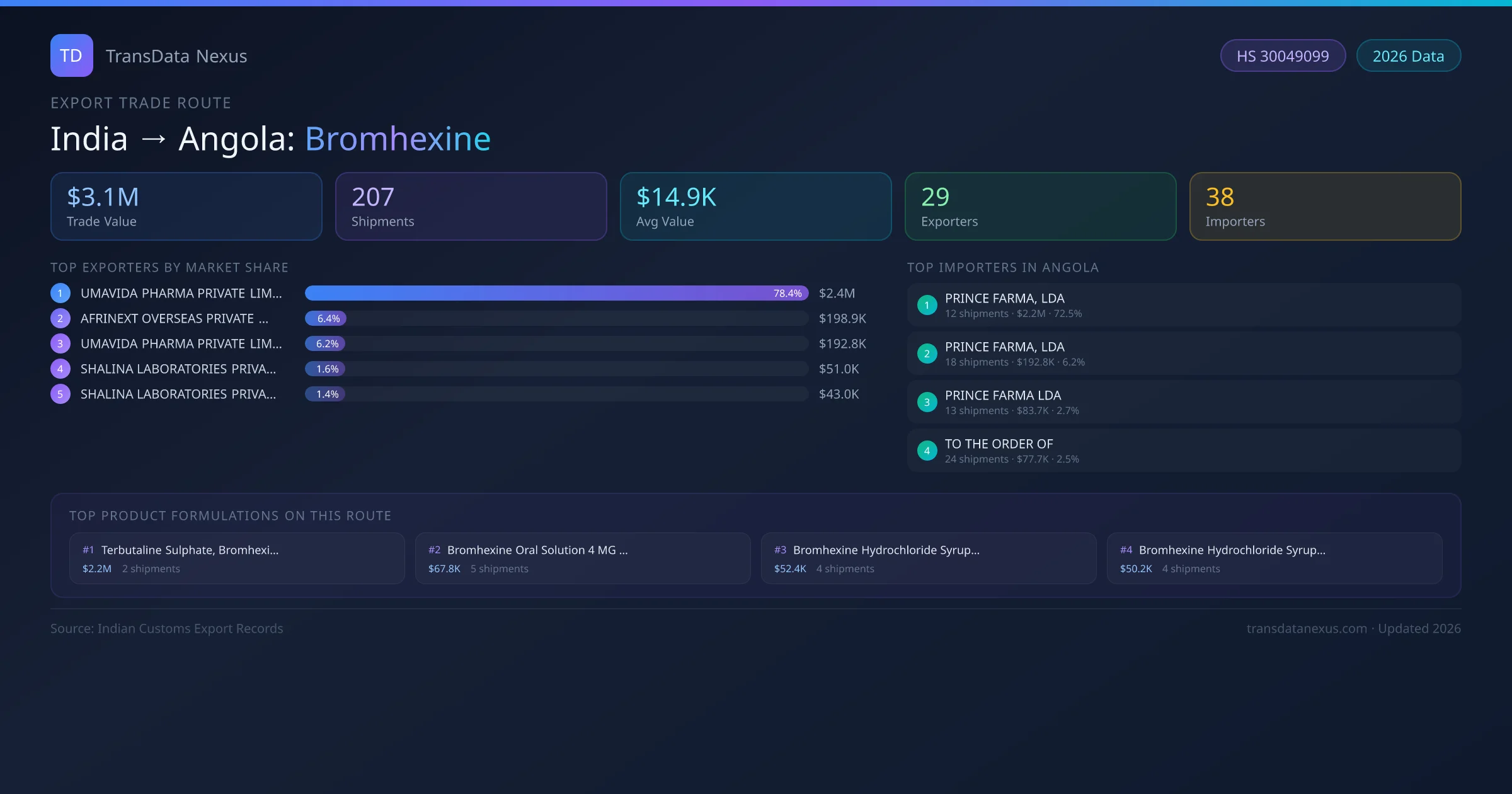 - 1.Route Identification: India to Angola export trade corridor identified from Indian Customs (DGFT) records for Bromhexine.