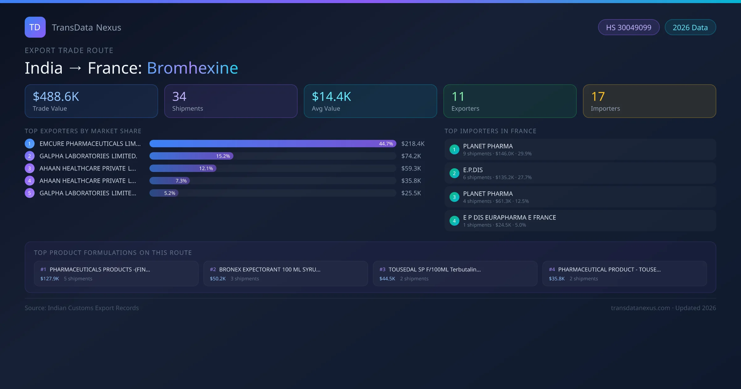 The India to France Bromhexine corridor is one of India's established pharmaceutical export routes, with 34 shipments documented worth a combined $488.6K USD. The route is dominated by EMCURE PHARMACEUTICALS LIMITED, which alone accounts for roughly 45% of all export value, reflecting the consolidated nature of India's bromhexine manufacturing sector.