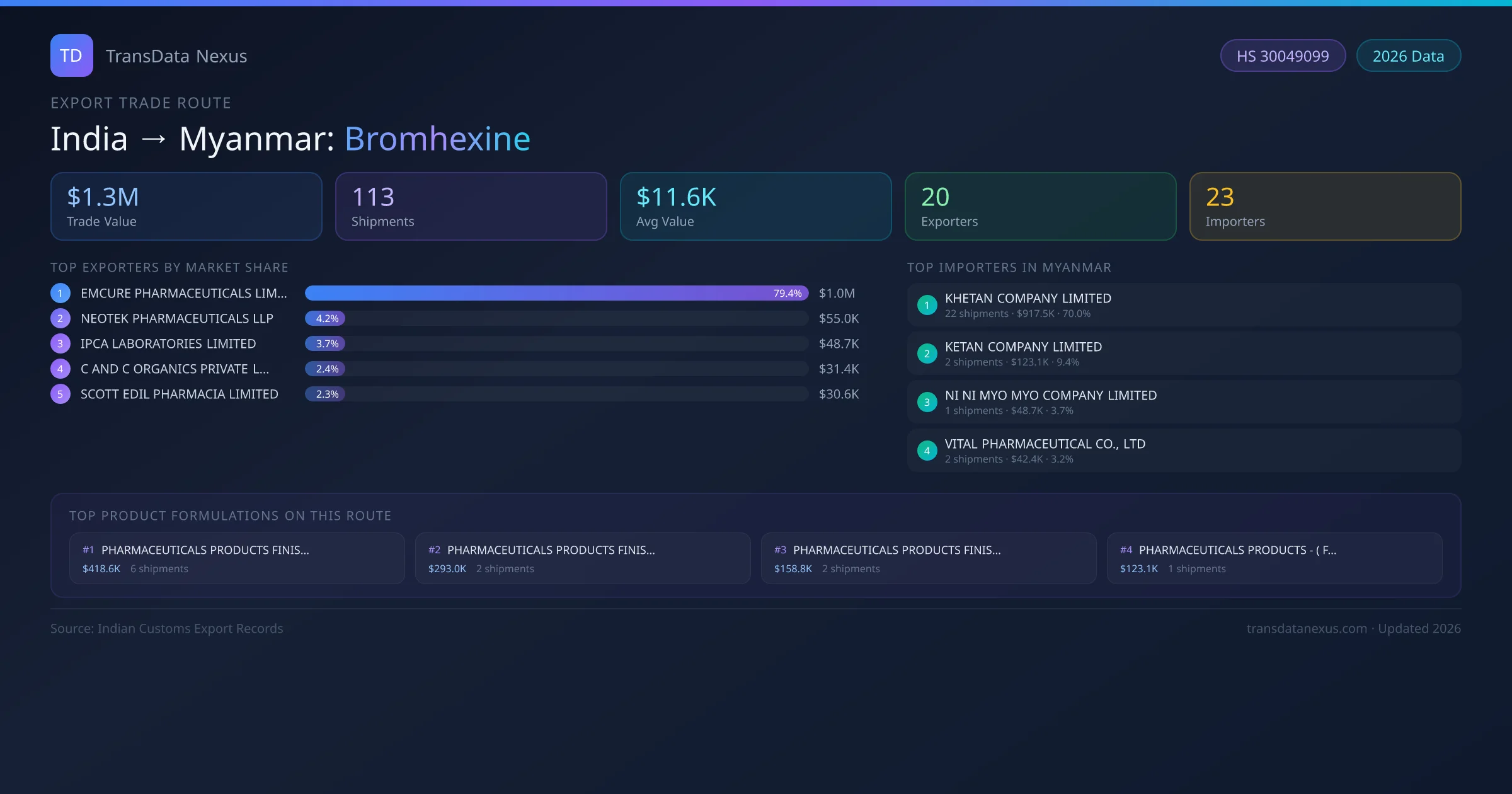 India has recorded 113 verified shipments of Bromhexine exported to Myanmar, representing a combined trade value of $1.3M USD. This corridor is served by 20 active Indian exporters, with an average shipment value of $11.6K USD. The leading Indian exporter is EMCURE PHARMACEUTICALS LIMITED, which accounts for 79% of total export value with 24 shipments worth $1.0M USD. On the buying side, KHETAN COMPANY LIMITED is the largest importer in Myanmar with $917.5K USD in purchases. The top 3 suppliers — EMCURE PHARMACEUTICALS LIMITED, NEOTEK PHARMACEUTICALS LLP , IPCA LABORATORIES LIMITED — together control 87% of total trade value on this route. All data sourced from Indian Customs (DGFT) shipping bill records. Values reported in FOB USD.