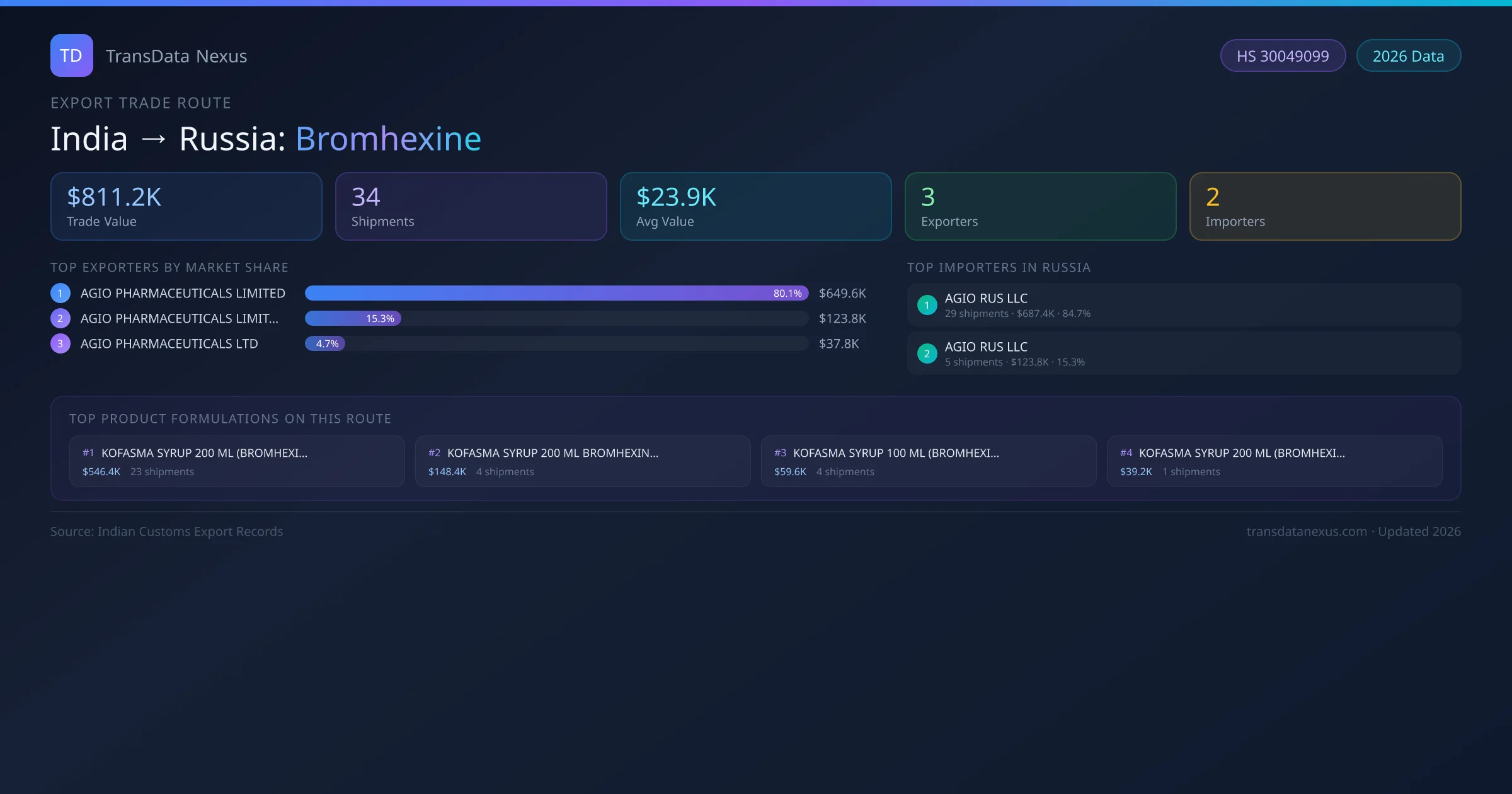 The leading Indian exporters of Bromhexine to Russia are AGIO PHARMACEUTICALS LIMITED, AGIO PHARMACEUTICALS LIMITED , AGIO PHARMACEUTICALS LTD. AGIO PHARMACEUTICALS LIMITED holds the largest market share at approximately 80% of total trade value on this route.