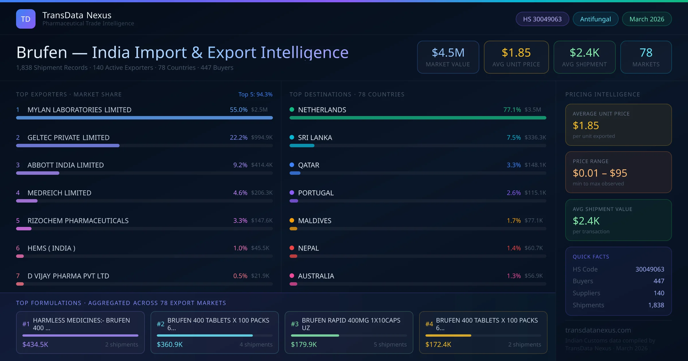Between 2022 and 2026, India exported $4.5M worth of brufen across 1,838 verified shipments to 78 countries — covering 40% of world markets in the Brand Names & OTC Products segment. The largest destination is NETHERLANDS (77.1%). MYLAN LABORATORIES LIMITED leads with a 55.0% share. All figures are drawn from Indian Customs (DGFT) shipping bill records spanning four years of trade activity.