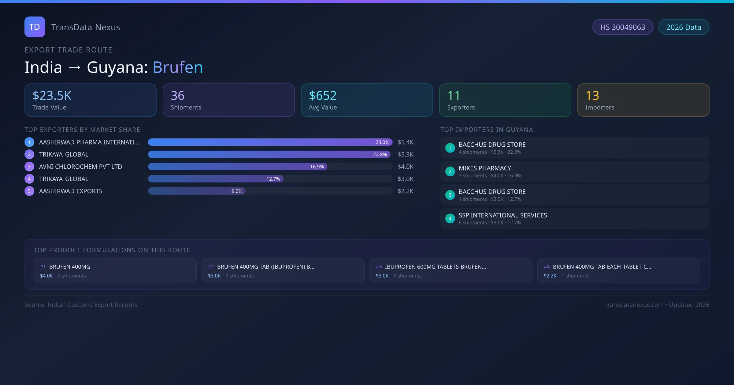 India has recorded 36 verified shipments of Brufen exported to Guyana, representing a combined trade value of $23.5K USD. This corridor is served by 11 active Indian exporters, with an average shipment value of $652 USD. The leading Indian exporter is AASHIRWAD PHARMA INTERNATIONAL PRIVATE LIMITED, which accounts for 23% of total export value with 14 shipments worth $5.4K USD. On the buying side, BACCHUS DRUG STORE is the largest importer in Guyana with $5.3K USD in purchases. The top 3 suppliers — AASHIRWAD PHARMA INTERNATIONAL PRIVATE LIMITED, TRIKAYA GLOBAL, AVNI CHLOROCHEM PVT LTD — together control 63% of total trade value on this route. All data sourced from Indian Customs (DGFT) shipping bill records. Values reported in FOB USD.