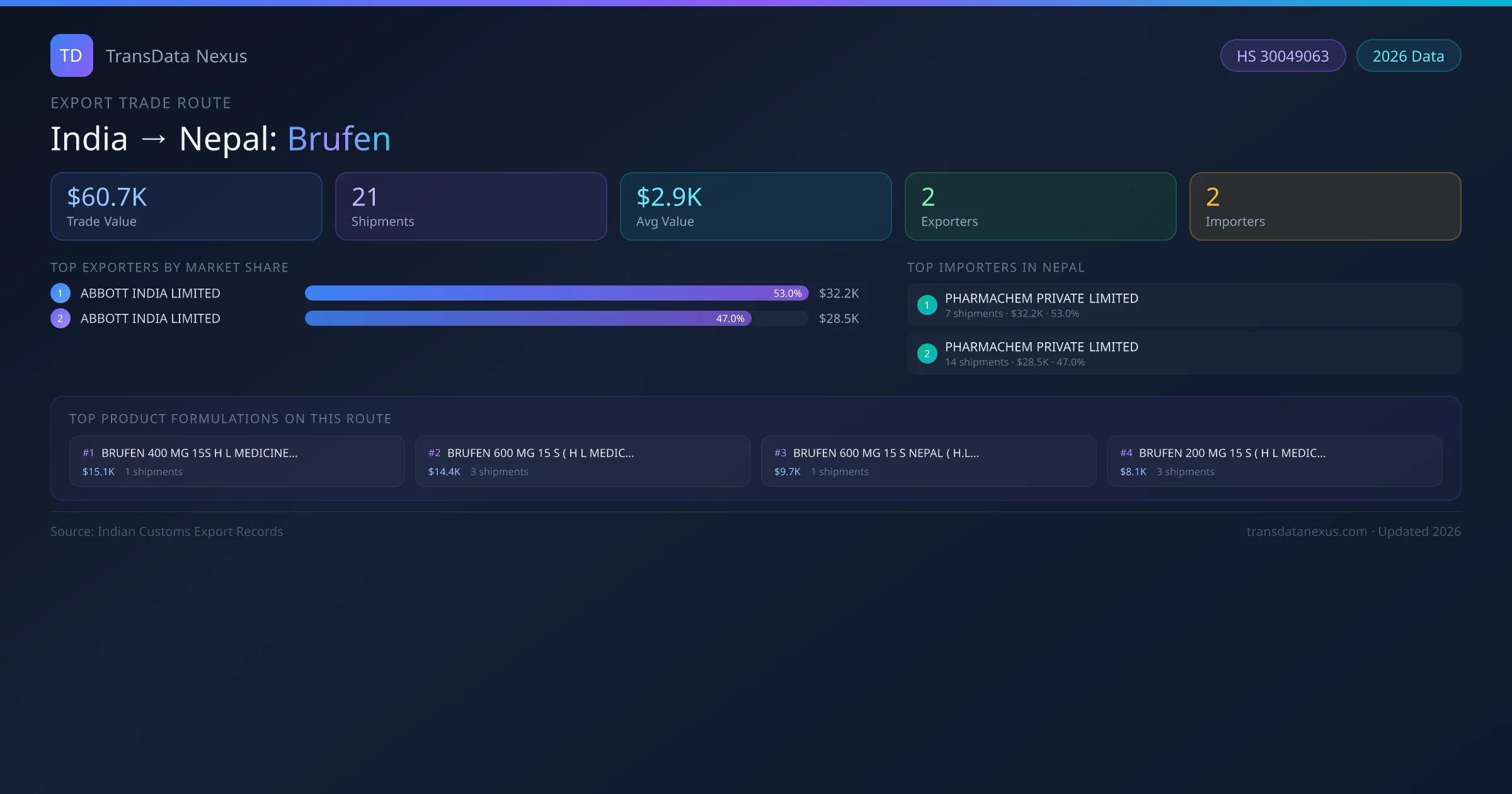 The India to Nepal Brufen corridor is one of India's established pharmaceutical export routes, with 21 shipments documented worth a combined $60.7K USD. The route is dominated by ABBOTT INDIA LIMITED , which alone accounts for roughly 53% of all export value, reflecting the consolidated nature of India's brufen manufacturing sector.