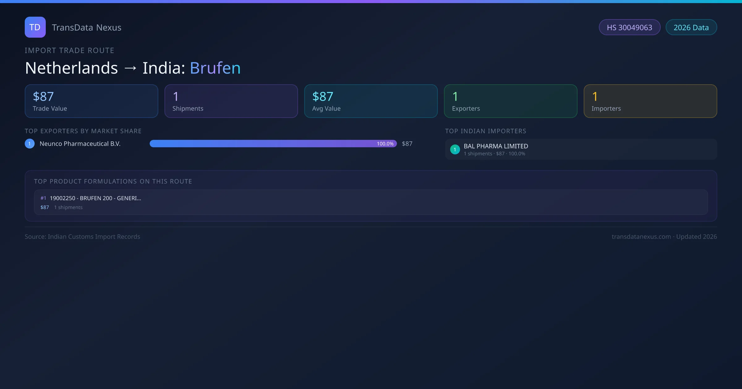 India has recorded 1 verified shipments of Brufen imported from Netherlands, representing a combined trade value of $87 USD. This corridor is served by 1 active Netherlands exporters, with an average shipment value of $87 USD. The leading Netherlands supplier is Neunco Pharmaceutical B.V., which accounts for 100% of total import value with 1 shipments worth $87 USD. On the buying side, BAL PHARMA LIMITED is the largest Indian importer with $87 USD in purchases. All data sourced from Indian Customs (DGFT) shipping bill of entry records. Values reported in FOB USD.