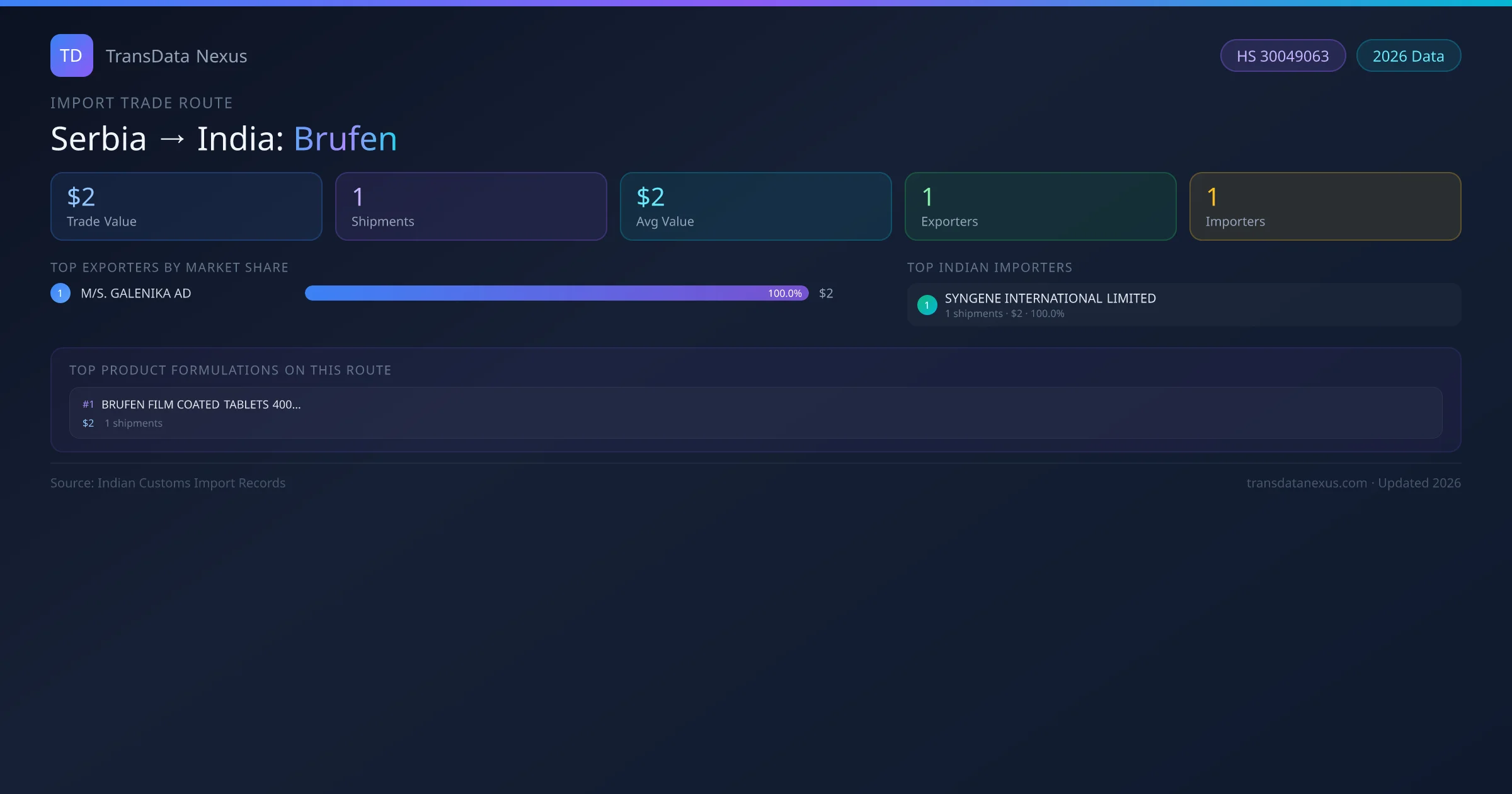 On the receiving end of this trade route, the leading Indian importers of Serbia brufen include SYNGENE INTERNATIONAL LIMITED . The largest importer is SYNGENE INTERNATIONAL LIMITED , accounting for $2 USD across 1 shipments — representing 100% of all brufen imports from Serbia on this route.