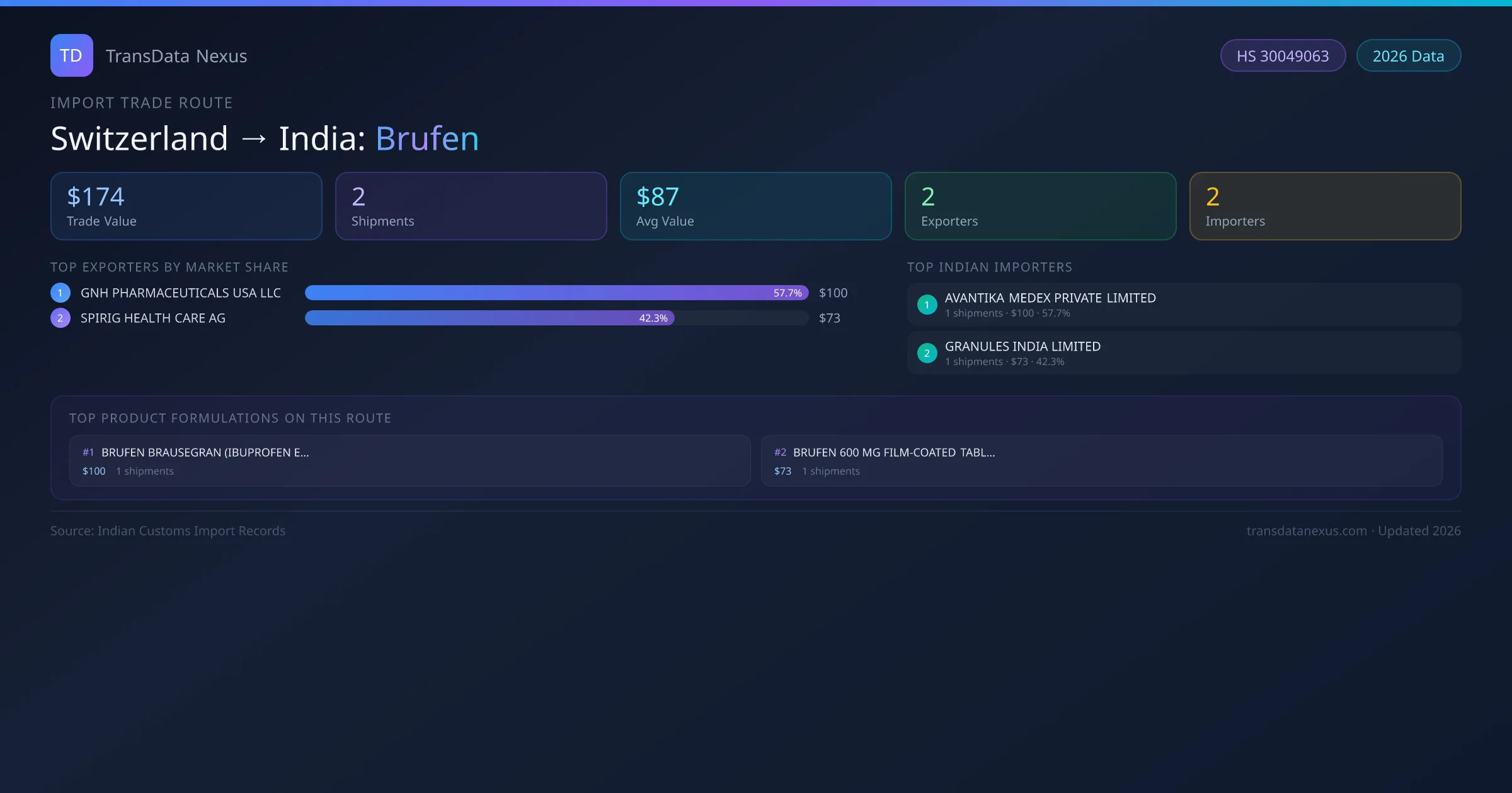 India has recorded 2 verified shipments of Brufen imported from Switzerland, representing a combined trade value of $174 USD. This corridor is served by 2 active Switzerland exporters, with an average shipment value of $87 USD. The leading Switzerland supplier is GNH PHARMACEUTICALS USA LLC, which accounts for 58% of total import value with 1 shipments worth $100 USD. On the buying side, AVANTIKA MEDEX PRIVATE LIMITED is the largest Indian importer with $100 USD in purchases. All data sourced from Indian Customs (DGFT) shipping bill of entry records. Values reported in FOB USD.