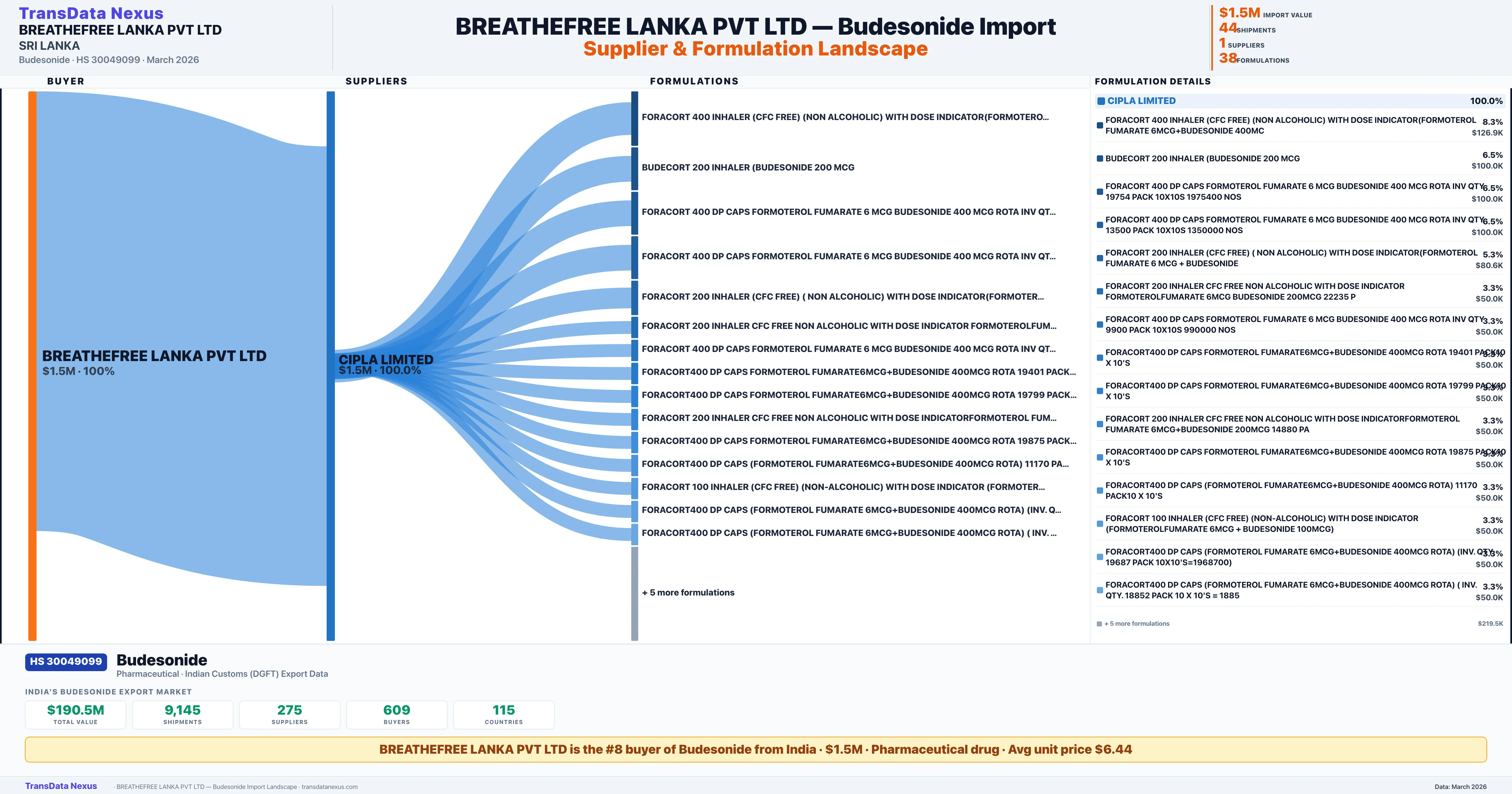 BREATHEFREE LANKA PVT LTD sources Budesonide from 1 verified Indian supplier: CIPLA LIMITED ($1.5M, 100.0%). This is based on 44 customs records.