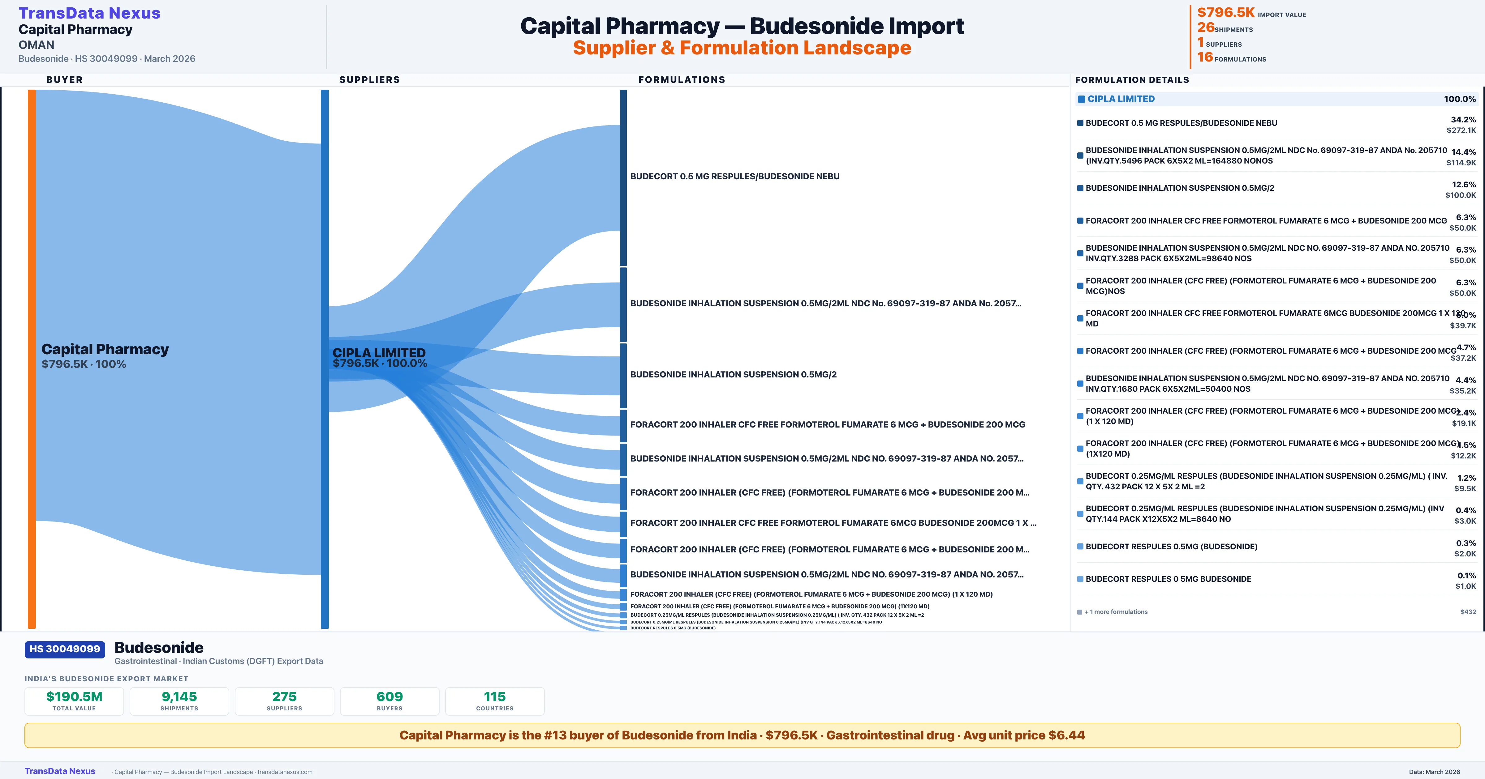 CAPITAL PHARMACY imports Budesonide to 1 country. The primary destination is OMAN receiving 100.0% of shipments worth $796.5K.