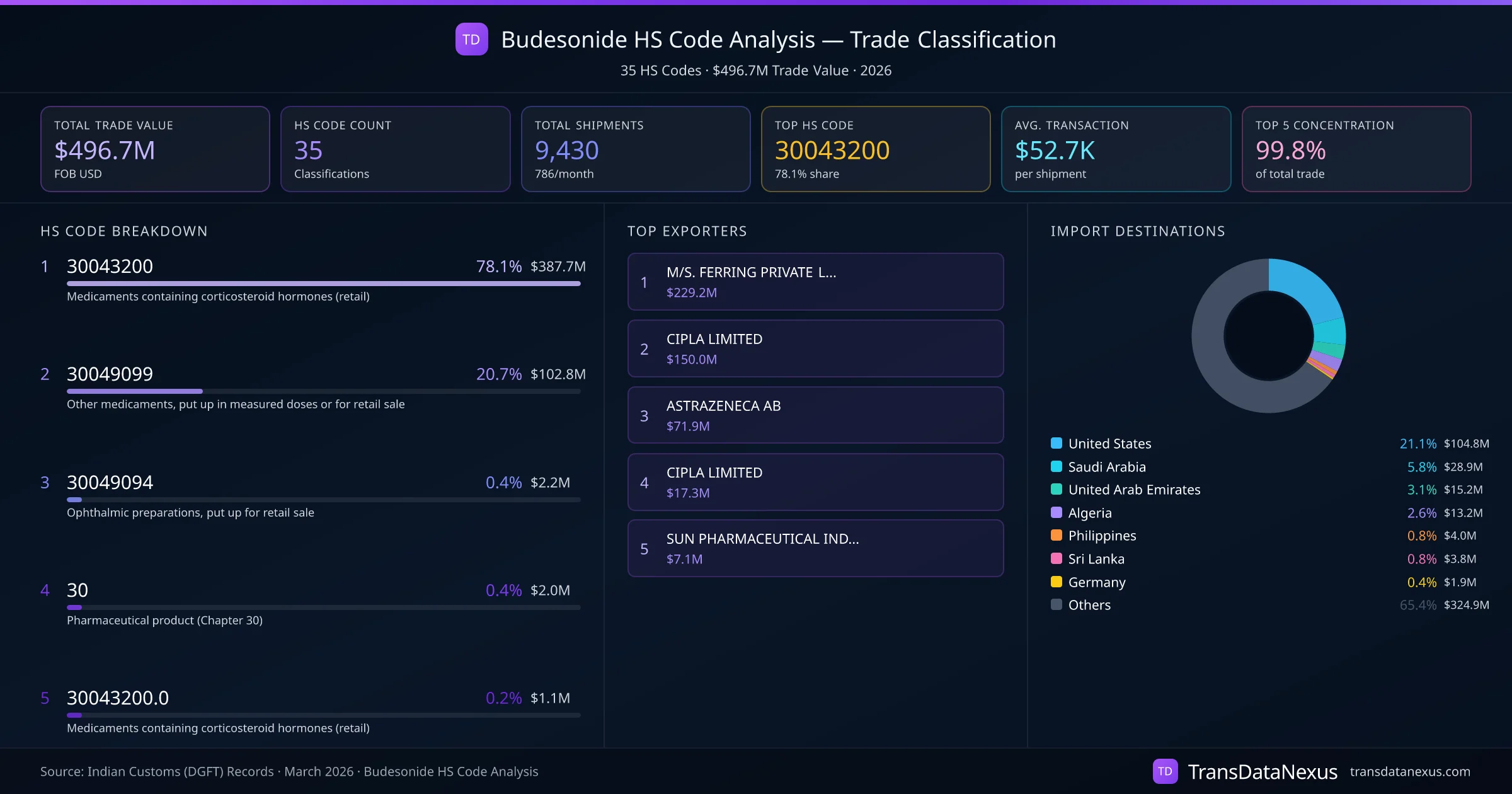 India exports Budesonide under 35 distinct HS code classifications, representing a total trade value of $496.7M across 9,430 shipments. The dominant classification is HS 30043200 (Medicaments containing corticosteroid hormones (retail)), accounting for 78.1% of all Budesonide trade at $387.7M. HS 30049099 (Other medicaments, put up in measured doses or for retail sale) follows at 20.7% ($102.8M). The top 5 HS codes together account for 99.8% of total Budesonide trade from India. The average transaction value is $52669. Key importing markets include United States, Saudi Arabia, United Arab Emirates. Leading exporters include M/S. FERRING PRIVATE LTD. and CIPLA LIMITED. Data sourced from Indian Customs (DGFT) shipping bill records.