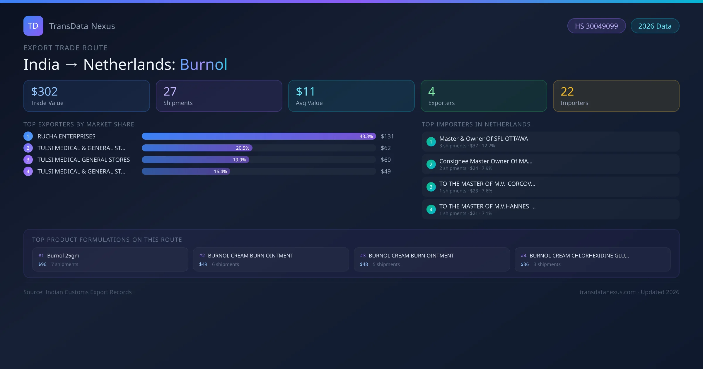 The India to Netherlands Burnol corridor is one of India's established pharmaceutical export routes, with 27 shipments documented worth a combined $302 USD. The route is dominated by RUCHA ENTERPRISES, which alone accounts for roughly 43% of all export value, reflecting the consolidated nature of India's burnol manufacturing sector.