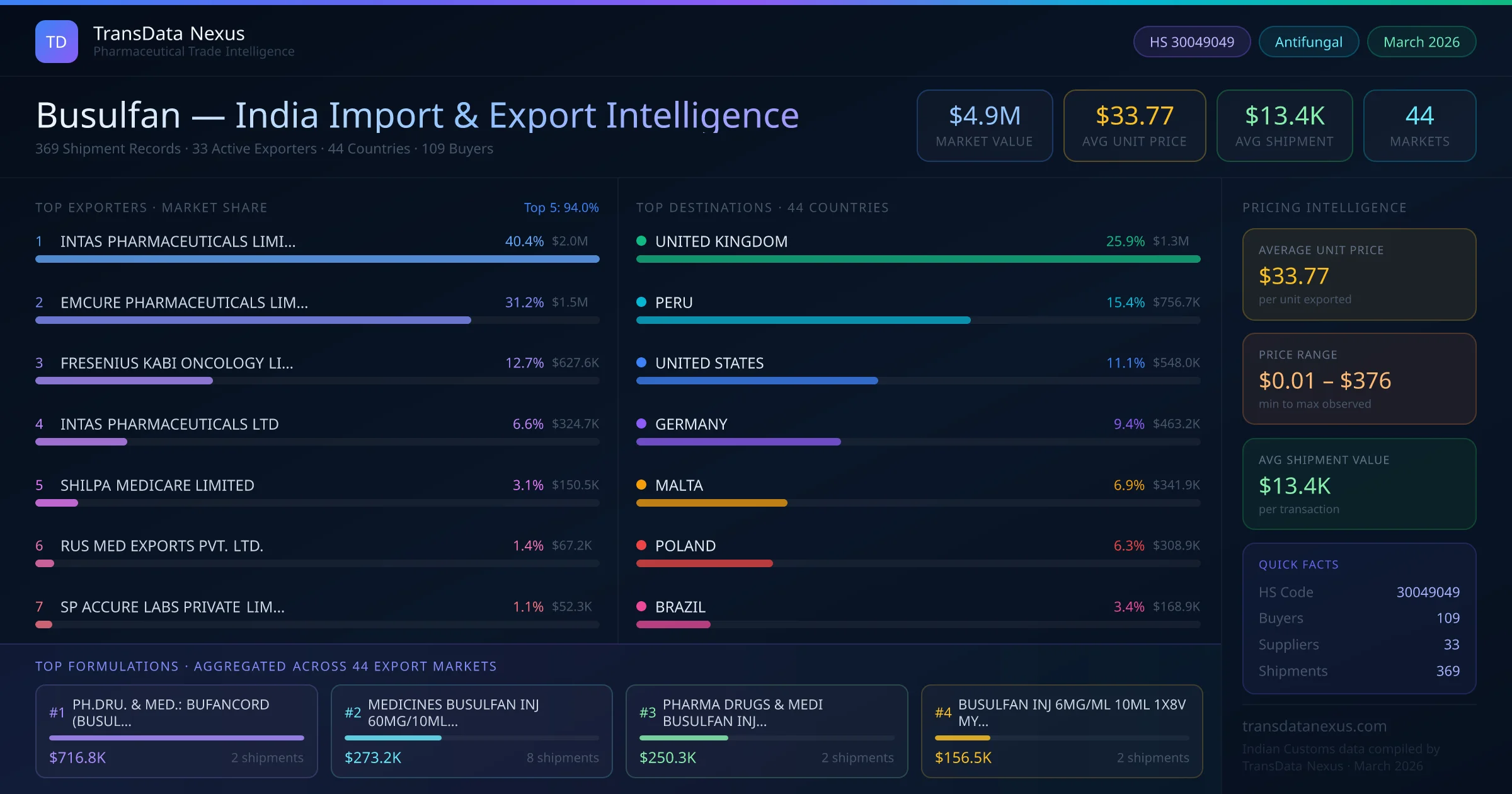 The average unit price for busulfan exports from India is $33.77 per unit, with prices ranging from $0.01 to $375.74 depending on formulation and order volume.