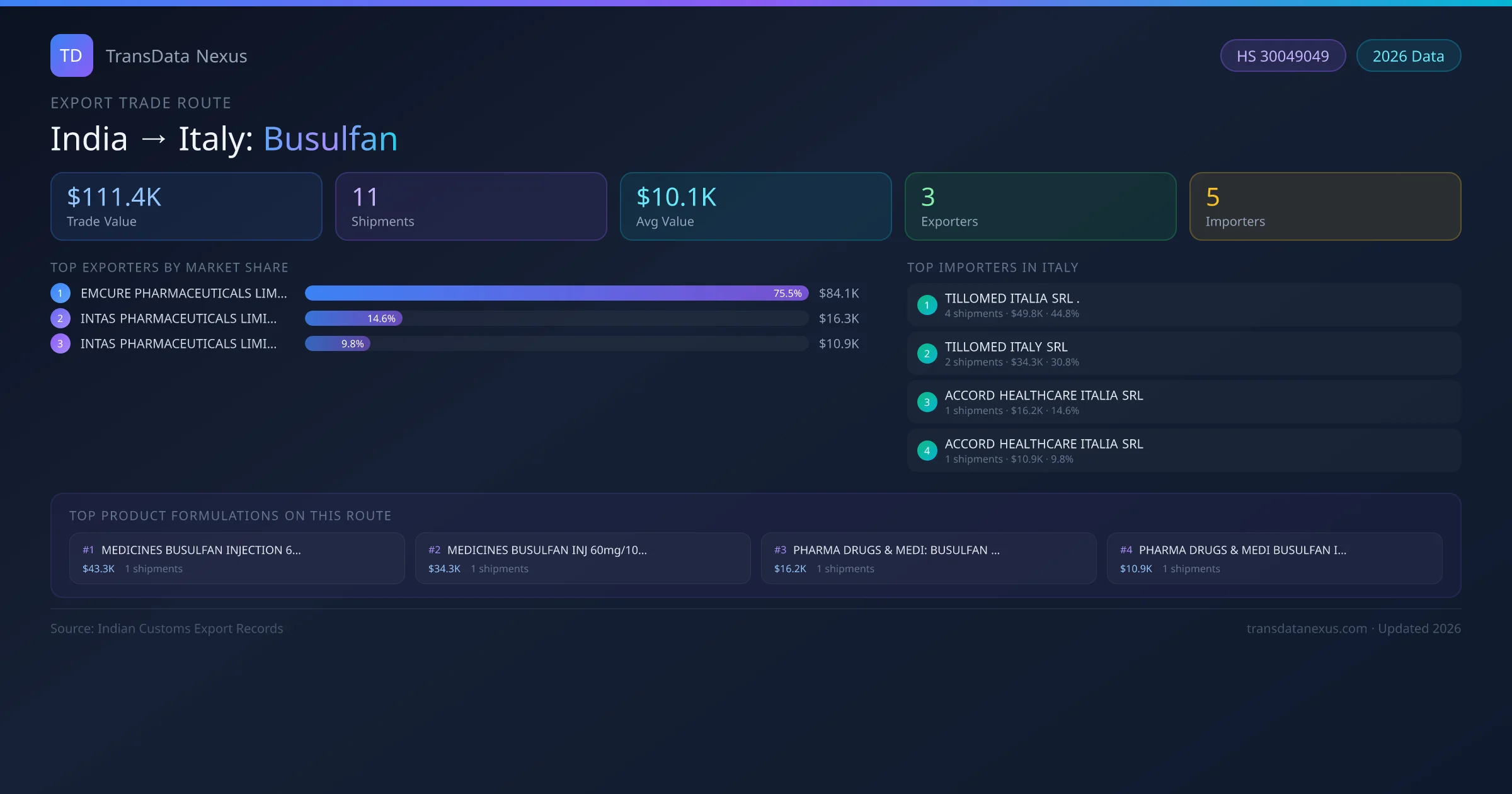 India has recorded 11 verified shipments of Busulfan exported to Italy, representing a combined trade value of $111.4K USD. This corridor is served by 3 active Indian exporters, with an average shipment value of $10.1K USD. The leading Indian exporter is EMCURE PHARMACEUTICALS LIMITED, which accounts for 76% of total export value with 6 shipments worth $84.1K USD. On the buying side, TILLOMED ITALIA SRL . is the largest importer in Italy with $49.8K USD in purchases. The top 3 suppliers — EMCURE PHARMACEUTICALS LIMITED, INTAS PHARMACEUTICALS LIMITED, INTAS PHARMACEUTICALS LIMITED — together control 100% of total trade value on this route. All data sourced from Indian Customs (DGFT) shipping bill records. Values reported in FOB USD.