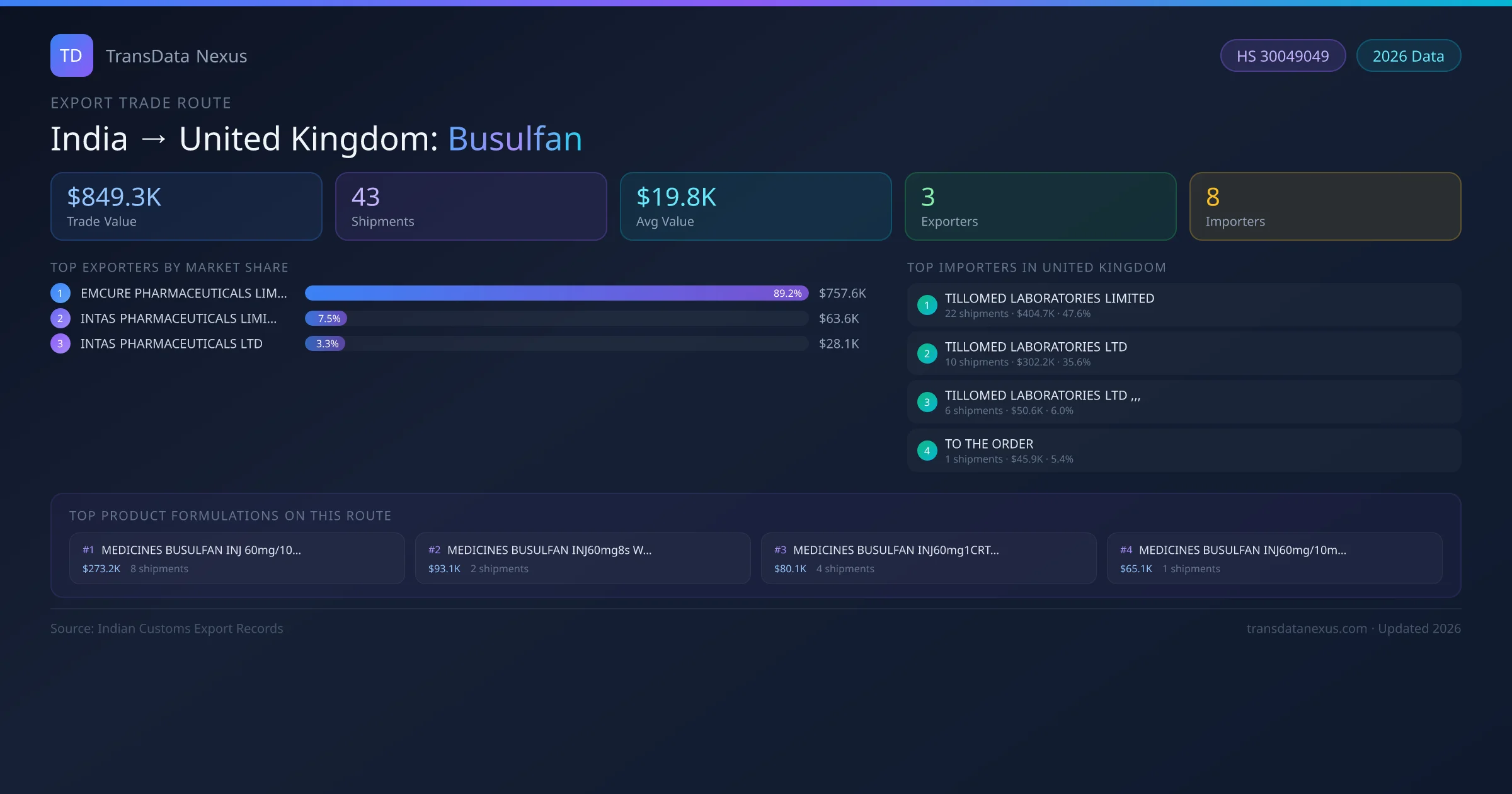 The leading Indian exporters of Busulfan to United Kingdom are EMCURE PHARMACEUTICALS LIMITED, INTAS PHARMACEUTICALS LIMITED, INTAS PHARMACEUTICALS LTD. EMCURE PHARMACEUTICALS LIMITED holds the largest market share at approximately 89% of total trade value on this route.
