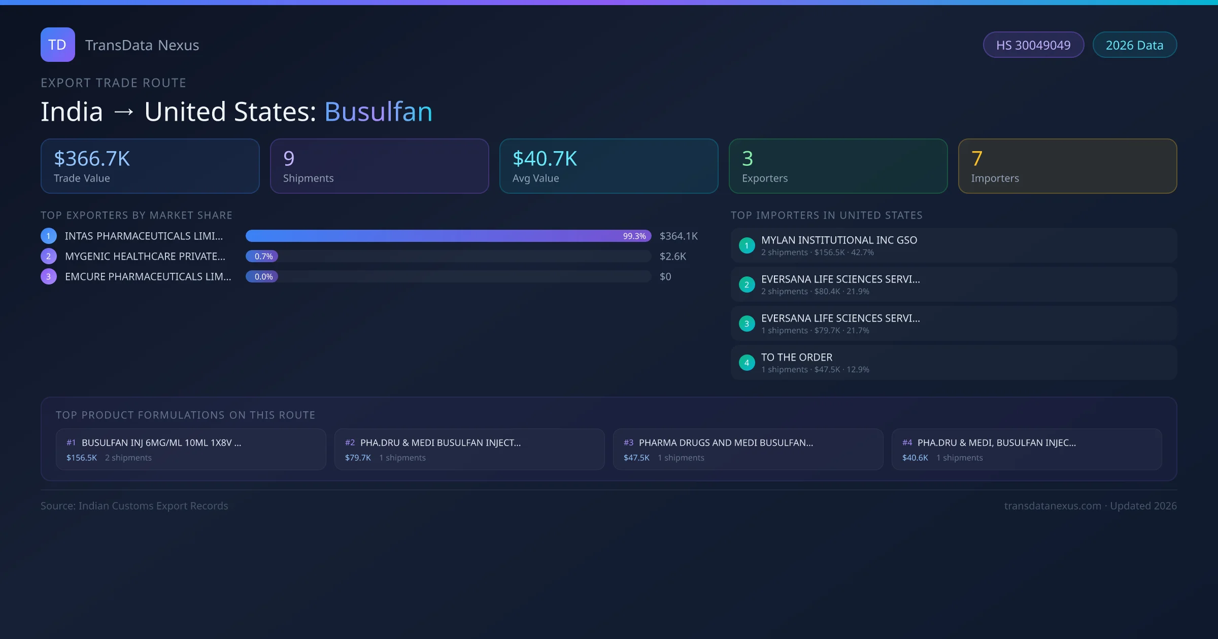 The India to United States Busulfan corridor is one of India's established pharmaceutical export routes, with 9 shipments documented worth a combined $366.7K USD. The route is dominated by INTAS PHARMACEUTICALS LIMITED, which alone accounts for roughly 99% of all export value, reflecting the consolidated nature of India's busulfan manufacturing sector.